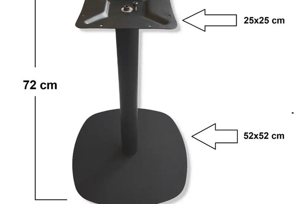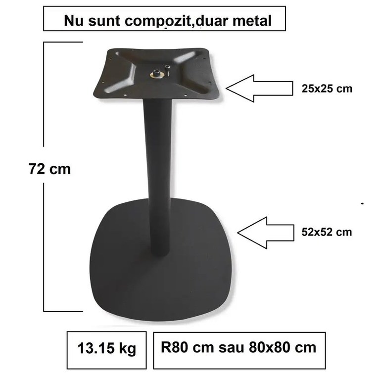 Picior pentru mese patrat sau rotund,80 cmBlad ideal : Φ60 cm ,Φ70 cm,Φ70 cm,Φ80 cm sau 60x60 cm, 70x70 cm,80x80 cmDimensiuni produs:Baza Metal : 52x52 cmTup median:Φ60 x 15 mm metal profilPlaca sup.: 250x250x2 mmBlad ideal : 600x600 mm - 700x700 mm,800x800 mm.Culoare: NegruDimensiuni suport suprafață: 25x25 cm.Dimensiuni bază: 52x52 cm.(4 mm placa metal)Înălțime bază: 72 cm.Dimensiuni tub: Φ60 x 15 mm metal profilTotal :13.15 kgBaza este potrivită pentru o suprafață de Φ70cm sau 70x70cm sau Φ80cm sau 80x80cm.