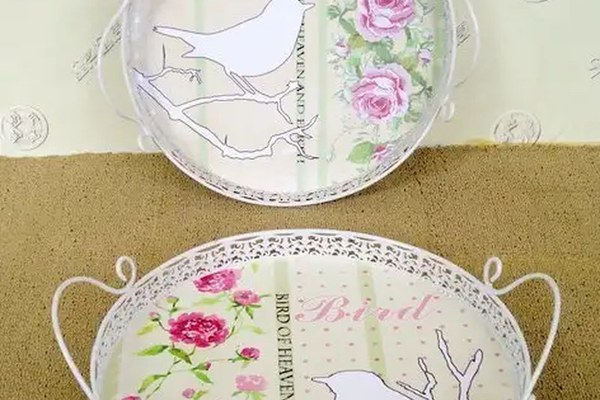 Set 2 tavi metalice pentru servire albe cu model romantic, pasari si flori .Se pot sterge, a nu se folosi detergent care sa atace suuprafetele. Dimensiunile produselor• Mare: 39 x 34 x 9 cm• Mic: 33,5 x 30 x 9 cm