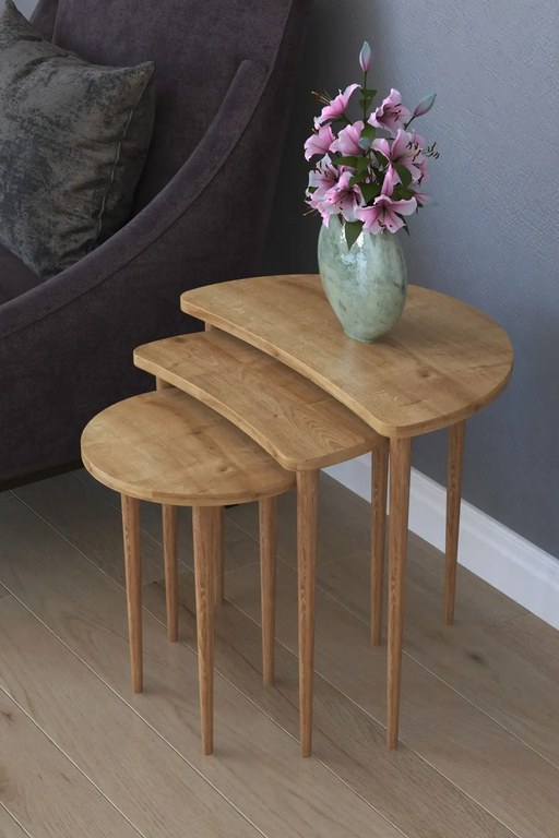 Set 3 masute pentru cafea model economic, cu linii simple,insa usor de integrat intr-un living sau birou.Setul este format din 3 masute cu dimensiuni diferite,astfel incat sa le poti depozita una sub alta pentru a nu ocupa spatiu si sa le poti trage usor in dreptul fiecarui musafir la nevoie.Blatul este realizat din pal de 18 mm stejar cu picioare din lemn culoare nuc.Se livreaza neasamblat, insotit de schita si accesorii montaj. Asamblarea se face de catre beneficiar, urmarind desenele de pe schita.Curatarea se face cu o carpa alba moale si solutii de curatare neabrazive. Dimensiuni:Masa mare: L 55, l 34.5, h 51 cmMasa medie: L 44, l 32.5, h 46 cmMasa mica: L 33,5, h 41 cm
