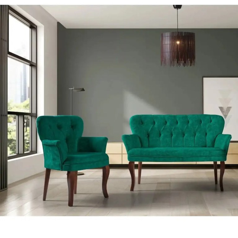 Culorile vibrante și designul unic fac din acest set o alegere perfectă pentru orice interior, aducând un strop de prospețime și eleganță în casa ta!Caracteristici avantajoase:Setul de canapea pentru 2 locuri și 1 fotoliu Cafe Homs îmbină armonios confortul cu estetica, oferindu-ți un spațiu dedicat relaxării. Culoarea verde proaspătă aduce natura în livingul tău, iar designul deosebit se potrivește atât în cadrele moderne, cât și în cele clasice.Confort și eleganță: Cu o adâncime generoasă și o înălțime perfectă a șezutului, acest set te invită la ore lungi de relaxare. Picioarele elegante adaugă un aspect rafinat, iar materialele de calitate asigură durabilitate și un aspect impecabil în timp.Dimensiuni:Fotoliu: L 68 cm, adâncime 68 cm, înălțime fără picioare 50 cm, înălțime până la șezut (picioarele: 30 cm)Canapea 2 Locuri: L 130 cm, adâncime 65 cm, înălțime picioare: 34 cmComandă acum și creează-ți propria zonă de relaxare, în care să te bucuri de momente de liniște și confort.Descoperă, de asemenea, întreaga colecție de canapele și fotolii pentru living Homs, precum și cea de colțare și scaune pentru zona de lounge. Alege piesa de mobilier preferată și adaugă produsul în coș! Bucură-te de un living elegant și practic, cu Homs!