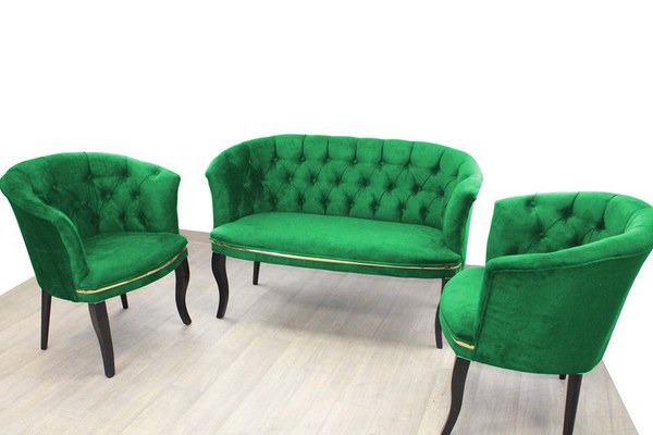 Set canapea și fotolii Milano Relax Homs - Eleganță clasică în tonuri de verdeAdaugă un aer sofisticat spațiului tău cu setul Milano Relax Homs, compus dintr-o canapea cu 2 locuri și două fotolii asortate. Cu un design clasic, tapițerie fină de culoare verde și detalii capitonate tip Chesterfield, acest set este ideal pentru zone de recepție sau livinguri elegante.Caracteristici și avantaje ale setului Milano Relax HomsTapițeria Premum din material textil verde, cu butoni capitonați specifici stilului Chesterfield, adaugă un plus de rafinament și eleganță, potrivindu-se perfect atât în decoruri clasice, cât și moderne.Picioarele sculptate din lemn oferă stabilitate și un aspect rafinat, completând designul sofisticat al acestui set.Tapițeria fină este plăcută la atingere și rezistentă la uzură, iar structura solidă asigură durabilitate pe termen lung.Dimensiuni: Fotolii: L 68 cm, adancime 68 cm, inaltime fara picioare 50 cm, inaltime pana la sezut (picioarele: 30 cm)Canapea 2 locuri: L 130 cm, adancime 65 cm, inaltime picioare: 34 cm