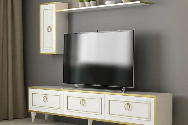 Set comoda tv si modul superior Elegance Homs, 180 x 45.5 x 29.5 cm, alb/auriu