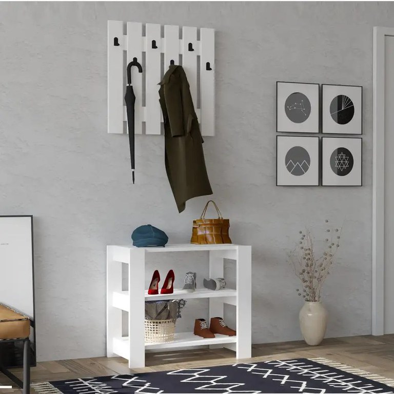 Creează un hol elegant și organizat - Alege setul de cuier de perete și pantofar Friends, în nuanța de alb!Acest set modern și practic este ideal pentru a menține holul tău curat și bine organizat. Transformă-ți spațiul de intrare într-un colț ordonat și stilat, cu setul format din cuier de Perete și pantofar Friends!Caracteristici și avantaje:- Material durabil: Realizat din PAL melaminat de 18 mm, setul este robust și ușor de întreținut, ideal pentru utilizarea zilnică.- Culoare elegantă: Nuanța de alb adaugă un aspect curat și luminos oricărui spațiu, potrivindu-se cu ușurință în orice decor.- Funcționalitate sporită: Cuierul dispune de 6 agățători pentru haine, oferind suficient spațiu pentru paltoane, jachete și accesorii. Pantofarul are două rafturi deschise pentru pantofi și un raft superior pentru pălării, genți sau alte accesorii.- Pachet compact: Vine ambalat într-un colet de 37 x 14 x 67 cm și cântărește 15 kg, facilitând transportul și asamblarea rapidă.- Dimensiuni: Pantofarul măsoară 69.8 cm în lungime, 33.6 cm în lățime și 60 cm în înălțime, oferind spațiu suficient pentru depozitarea pantofilor și a accesoriilor. Cuierul are o lungime de 63 cm și o lățime de 60 cm, perfect pentru a găzdui hainele tale de zi cu zi.Decor tips pentru setul de cuier de perete și pantofar FriendsCompletează setul Friends cu accesorii moderne și practice. Adaugă o oglindă elegantă lângă cuier sau o comodă pentru chei și alte obiecte personale. Utilizează coșuri decorative pe raftul superior al pantofarului pentru a păstra accesoriile ordonate. Asortează setul cu un covor de intrare elegant, pentru un spațiu de tranziție confortabil și stilat. De asemenea, descoperă și alte cuiere și pantofare ale colecției Homs!Transformă-ți holul într-un spațiu organizat și primitor! Adaugă acum setul de cuier de perete și pantofar Friends în coșul tău de cumpărături!