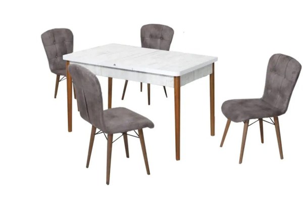 Set masa alba extensibila cu 4 scaune tapitate gri Homs picioare lemn 110 x 70 cm- un model elegant pentru orice livingNoul set masa alba extensibila cu 4 scaune tapitate gri Homs picioare lemn 110 x 70 cm se poate folosi in restaurant, sala de mese, in living, sau bucatarie. Masa cu picioare de lemn si blat marmorat aduce cu sine un design unic, in stil contemporan, care infrumuseteaza orice casa. Realizata pe picioare de lemn si blat de 18 mm de culoare nuc cald, masa aduce cu sine o atmosfera mai eleganta si mai primitoare. Dimensiuni:Masa: L 110, l 70, h 75 cmMasa extinsa: L 140, l 70, h 78 cmScaun: L 47, l 42, h 88 cmSeturi mese si scaune bucatarie- accesori must-have din orice casaEste un set contemporan, in acord cu ultimele trenduri, cu design deosebit ce poate deveni un punct central in living sau bucatarie, pentru zona de servit masa.Perfecta pentru aranjarea preparatelor, cat si pentru gatit, masa extensibila are atat rol estetic, cat si functional. Modelul de dimensiuni medii se poate extinde usor, fiind ideala si-n apartamentele restranse, dar si in casele ample.Ia masa impreuna cu membrii familiei, adu-ti prietenii mai aproape la seri de pizza sau aniversari si sarbatoriti fiecare moment. Masa extensibila de bucatarie se livreaza neasamblata, fiind insotita de schita si accesorii pentru montaj. Montajul se realizeaza de catre beneficiar. Curatarea se face cu o carpa moale alba si produse de curatenie neabrazive specifice tipului de material.Daca vrei sa mai adaugi scaune in casa, comanda un set de scaune bucatarie, in nunate simple de bej sau colorate.Vezi mai multe mese bucatarie si lasa-ti imaginatia sa creeze cele mai atractive decoruri.Masa este realizata din pal de 18 mm, cu picioare lemn.Se livreaza in toata tara prin curier neasamblate, coletele fiind insotite de schita si accesorii montaj. Asamblarea se face de catre beneficiar.Curatarea cu o carpa alba moale si produse de curatenie neabrazive specifice.