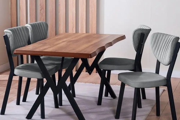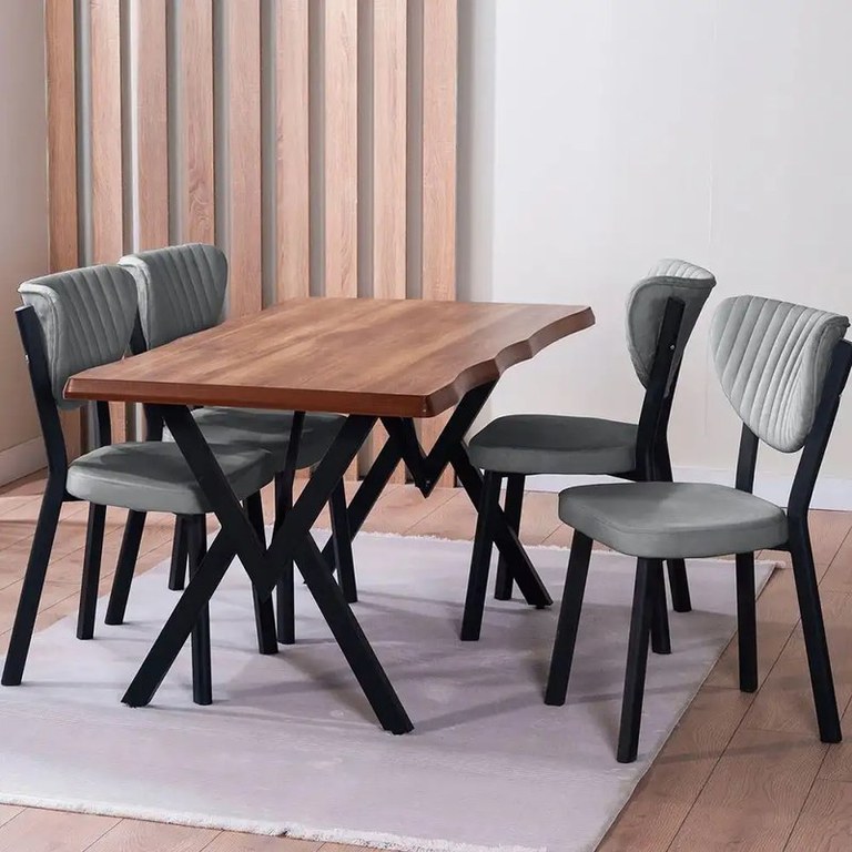 Set de dining elegant și funcțional, compus din masă cu blat MDF finisaj nuc și 4 scaune metalice tapițate gri. Ideal pentru bucătărie sau living – un mix reușit între design modern și confort.Descriere detaliată:Transformă zona de luat masa într-un spațiu modern și primitor cu setul Barton, compus dintr-o masă robustă din MDF și 4 scaune metalice tapițate. Cu un design contemporan și materiale de calitate, acest set este ideal pentru bucătărie, living sau dining open-space.Blatul de 36 mm grosime (dublu stratificat: 18 + 18 mm) are un finisaj cald de nuc, care aduce un aer rafinat oricărui interior. Picioarele metalice asigură stabilitate și durabilitate, iar scaunele, cu schelet metalic și tapițerie gri, oferă confort și stil.Caracteristici principale:Set complet: 1 masă + 4 scauneMateriale de calitate: blat din MDF gros de 36 mm, picioare și structură metalicăDimensiuni ideale pentru familie: 140 x 80 x 72 cmScaune comode: structură metalică solidă, tapițerie textilă griStil modern-industrial: potrivit pentru bucătării, livinguri și open space-uriSpecificații tehnice:Masă:Material blat: MDF 36 mm (18+18 mm)Dimensiuni: 140 x 80 x 72 cmCuloare blat: NucPicioare: MetalScaune (4 bucăți):Cadru: profil metalicTapițerie: textil gri