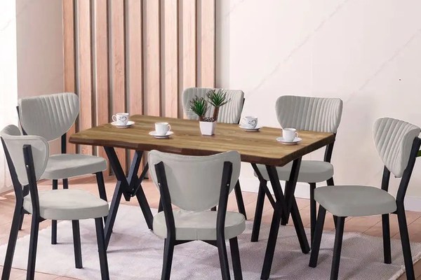 Set Masa Barton din MDF cu 6 Scaune din metal, Caracteristici principale:Set complet: 1 masă + 6 scauneMateriale de calitate: blat din MDF gros de 36 mm cu finisaj nuc, picioare și structură metalicăDimensiuni ideale pentru familie: 140 x 80 x 72 cmScaune comode: structură metalică solidă, tapițerie textilă maroStil modern-industrial: potrivit pentru bucătării, livinguri și open space-uriSpecificații tehnice:Masă:Material blat: MDF 36 mm (18+18 mm)Dimensiuni: 140 x 80 x 72 cmCuloare blat:nucPicioare: MetalScaune (4 bucăți):Cadru: profil metalicTapițerie: textil maro
