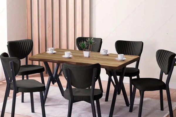 Set Masa Barton din MDF cu 6 Scaune din metal, culaore nuc si negru, 140 cm