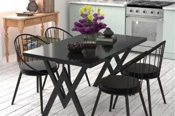 Set Masa Bucatarie cu 4 Scaune , negru - ansamblu sofisticat pentru familia taNoul Set Masa Bucatarie cu 4 Scaune , negru este un ansamblu elegant si modern, care se integreaza de minune in zona de dining din living sau in bucatarie. Setul este coceput pentru 4 ersoane, iar masa are o suprafata generoasa de servit meniurile preferate. Picioarele gemoetrice sunt realizate din metal si sunt vopsite in negru, lucru ce ii confera un plus de eleganta in casele minimaliste, moderne.Dimensiuni: MASA : L 120, l 80, h 75 cm;SCAUNE : L 55, h 75 cm.(SEZUT H:40)Daca iti cauti un ansamblu unic si vrei sa aduci unitate camerei de zi, ori bucatariei, acest set este ce cautai. Blatul are un finisaj glossy, lucru care ii ofera un avantaj in curatare, fara sa se pateze cu alimente sau bauturi. Designul contemporan pastreaza linii drepte si simple, si este completat de confortul oferit de scaune. Acestea au spatar rotunjit si zona de sezut este de densitate medie, contribuind la felul in care se distribuie greutatea.Pentru a reusi sa o pui in evidenta, opteaza pentru alte elemente decorative din pal alb sau introdu mai multe plante de interior pentru o pata de culoare.Daca optezi pentru o masa extensibila, mai poti completa cu inca 2 scaune pentru bucatarie, in nunate colorate pentru a anima cadrul.Masa este de calitate si se curata usor, fara sa se zgarie si fara ca blatul sa se umfle sau deformeze intr-un mediu umed, cum e bucataria.Acest model complex si practi poate fi integrat si in lantul Horeca, in sali de mese, resturante sau pensiuni. Masa se livreaza neasamblata, fiind insotita de schita si accesorii pentru montaj. Montajul se realizeaza de catre beneficiar.Blatul nu este pregaurit.Scheletul metalic se infileteaza impreuna cu blatul cu o surubelnita manuala sau electrica. Curatarea se face cu o carpa moale alba si produse de curatenie neabrazive specifice tipului de material.Vezi mai multe seturi mese si scaune bucatarie si da viata casei tale.