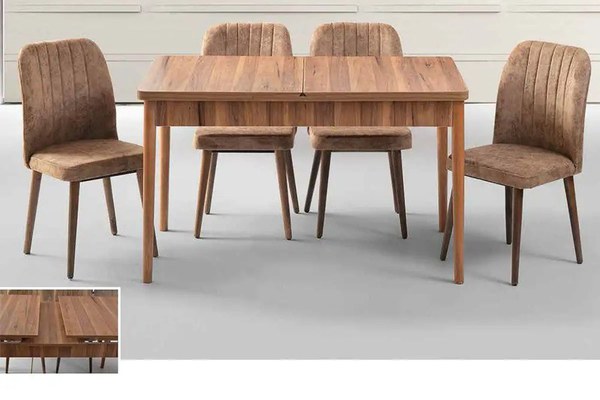 Set masa extensibila cu 4 scaune – alegerea versatila pentru orice casaSetul de masa extensibila cu 4 scaune tapitate nuc-maro este o alegere eleganta, datorita cromaticii sale. Lemnul de nuc se imbina cu tapiteria maro a scaunelor, avand ca rezultat un ansamblu ce se remarca prin simplitate si sofisticare. Cele patru scaune sunt imbracate intr-o tapiterie fina si moale, in culoare maro.Aceasta este rezistenta la uzura, datorita calitatii sale de exceptie. Picioarele de nuc contribuie la imaginea eleganta a acestora, dar le ofera in acelasi timp un design robust si rezistent. Masa este confectionata din pal de 18 mm cu picioare de lemn. Se curata cu o carpa moale si produse de curatenie neabrazive.Dimensiuni:Masa: L 130, l 80, h 75 cmMasa extinsa: L 170, l 80, h 78 cmScaun: L 55, l 55, h 95 cmSet masa cu scaune, inspiratia ta de zi cu ziSetul de masa cu scaune tapitate cargold nuc-maro poate fi amplasat intr- bucatarie cu note clasice, chiar si intr-un decor cu inspiratie countryhouse. In acelasi timp, intregul stau farmec consta in versatilitatea de care da dovada, deoarece masa cu scaune poate fi integrata la fel de bine si intr-un decor modern. Daca alegi sa amplasezi masa cu scaune in sufragerie, alege o comoda TV din lemn, in ton cu masa, pentru a pastra naturaletea si cromatica simpla si curata. Un coltar extensibil este o alegere inspirata in acest context, pentru ca va oferi un confort aparte, dar si un plus de functionalitate.Descopera mai multe seturi de mese cu scaune si decoreaza inspirat.