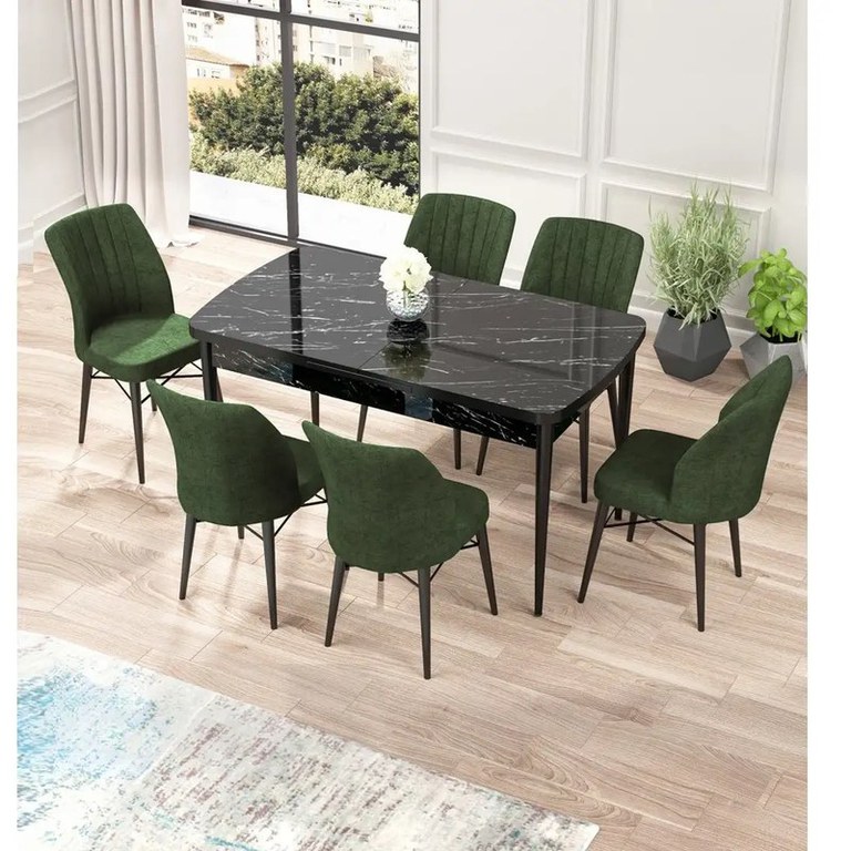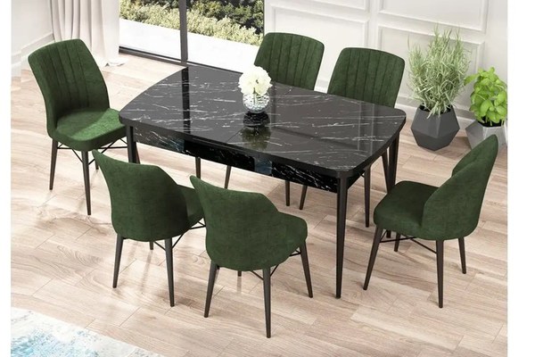 Set masa extensibila cu 6 scaune tapitate Homs cargold negru verde – ansamblul pentru o sufragerie sofisticată Setul de masă cu 6 scaune este perfect pentru a da un aer modern și elegant oricărei sufragerii sofisticate, sau unei bucătării elegante. Masa este extensibilă, astfel încât poate fi utilizată pentru mesele în care toată familia se adună la masă, sau pentru serile de jocuri de societate și povești alături de cei mai buni prieteni.Masa extensibila se poate mari de la 130 cm la 170 cm rapid si usor.Irizațiile marmorate și luciul negru al mesei contribuie la aerul său exclusiv, transformând-o într-o piesă ce va deveni punct central al camerei, datorită designului său unic. Tapițeria elegantă a scaunelor realizează un contrast rafinat cu picioarele negre și cu masa.Dimensiuni:Masa: L 130, l 80, h 75 cmMasa extinsa: L 170, l 80, h 78 cmScaun: L 55, l 55, h 95 cmSet masa extensibila cu 6 scaune – idei de decorare Pentru a crea un spațiu sofisticat și modern cu ajutorul setului de masa cu scaune, poți asorta setul cu piese contemporane de mobilier, precum o canapea cu linii curate si simple. Alege o nuanță neutră, precum beige sau maro pentru canapea, daca vrei sa creezi un decor rafinat. Dacă vrei să optimizezi spațiul din casă, o canapea extensibilă ar fi o optiune practică.Dacă dorești un stil eclectic original, combina setul cu piese vintage si elemente colorate si vei crea un spațiu plin de personalitate. De exemplu, poți adăuga o lustră metalică, o măsuță de cafea vintage sau o pictură coloratata, alaturi de cativa tabureti. Descopera mai multe seturi de mese si scaune din colectia noastra.Se livrează prin toată țara prin curier. Dacă nu ești mulțumit sau crezi că nu se potrivesc în decorul casei tale, poți returna setul de masă cu scaune în termen de 14 zile.