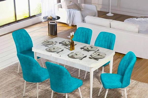 Set masa extensibila cu 6 scaune tapitate Homs cargold 250-30355,turcoaz – cromatica vie, contrastantaSetul masa extensibila cu 6 scaune tapitate in tonuri vii de turcoaz, este o alegere sofisticata si eleganta pentru orice sufragerie moderna. Finisajul marmorat al mesei o transforma intr-un element central de lux, plin de rafinament. Se poate extinde pentru a acomoda un numar mai mare de persoane atunci cand gazduiesti o cina in familie sau o seara relaxanta cu prietenii.Scaunele cu design rotund si tapitaterie textila, din material rezistent si confortabil vin in contrast cu masa si schimba intreaga imagine a incaperii, datorita cromaticii scaunelor.Dimensiuni:Masa: L 130, l 80, h 75 cmMasa extinsa: L 170, l 80, h 78 cmScaun: L 52, l 55, h 95 cmSet masa cu 6 scaune – ansamblul de care ai nevoie intr-o sufragerie modernaPentru a accentua si mai mult eleganta si stilul modern al acestui set, se poate opta pentru o canapea extensibila. Aceasta va aduce un plus de functionalitate, deoarece iti va permite sa o transformi la nevoie intr-un pat comod. In plus, exista multe variante de canapele cu tapiterie colorata, daca vrei sa mergi pe o linie cromatica plina de viata in intreaga camera.Alege si o comoda TV potrivita, pastrand paleta de culori deschise si creeaza un spatiu de relaxare si divertisment pentru toata familia. Daca spatiul iti permite, incearca sa separi zona dedicata cinei, unde amplasezi masa cu scaune si zona de relaxare.Exploreaza mai multe modele de mese cu scaune si alege cel mai potrivit ansamblu in functie de cromatica si de stilul casei tale, dar si tinand cont de personalitatea si preferintele pe care le ai.