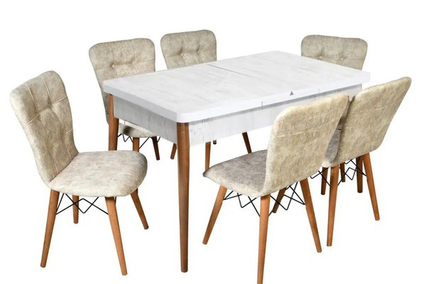 Set masa extensibila cu 6 scaune tapitate Homs cristal alb-bej 170 x 80 cm