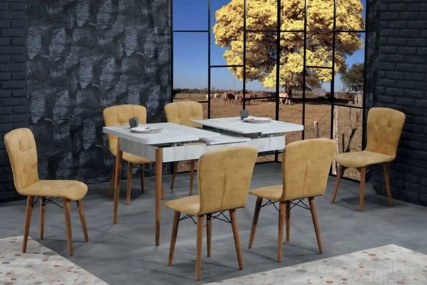Set masa extensibila cu 6 scaune tapitate Homs cristal alb-mustar- ansamblul perfect din bucatarie sau livingAcorda livingului sau bucatariei tale un spatiu perfect pentru cina in familie cu un set masa extensibila cu 6 scaune tapitate Homs cristal alb-mustar. Cu dimensiuni generoase de 170 x 80 cm, masa extensibila este piesa perfecta din cadrele cozy si armonioase, in care vrei sa petreci timp cu cei dragi. Setul este destinat pentru locul de servire al mesei, fie ca este vorba de bucatarie, living sau zona speciala de dining. Este un set de dining modern, cu masa in culori calde si contrastante, decorata cu un model inspirat de roci pe blatul alb, lucru ce te va face sa nu doresti sa o acoperi. Cele 6 scaune sunt tapitate cu material textil galben mustar, in acord perfect cu picioarele de lemn.Cum sa integrezi un set masa extensibila cu 6 scaune in casaDaca beneficiezi de un open space in living, alege sa intregesti cadrul cu o canapea extensibila, care sa te ajute sa economisesti loc ziua. Datorita mecanismului de extensie, te poti bucura si de un pat generos, peste noapte, ori cand ai musafiri.Scaunele tapitate in nunate de galben pal, se potrivesc cu o mobila in nuante de nuc sau stejar. De aceea, este indicat sa alegi si un set de fotolii cu picioare de lemn, in stil Berjer.La nivelul peretului, ai mai mult loc de desfasurare. Astfel, economisesti mai mult loc la nivelul solului, in sala de dining, mai ales daca ai un set de masa cu scaune. Poti aranja cu usurinta cateva rafturi de perete, pentru a te bucura de un aer reimprospatat si mai armonios.Masa este confectionata din pal de 18 mm. Se livreaza in toata tara prin curier neasamblate, coletele fiind insotite de schita si accesorii montaj. Asamblarea se face de catre beneficiar.Curatarea cu o carpa alba moale si produse de curatenie neabrazive specifice. Vezi si alte modele de mese bucatarie si scaune si completeaza-ti casa, in nuante antrenante si atragatoare.Dimensiuni:Masa: L 130, l 80, h 75 cmMasa extinsa: L 170, l 80, h 78 cmScaun: L 47, l 42, h 88 cm