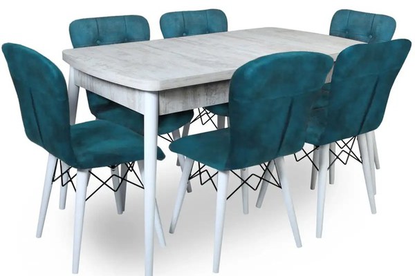 Set masa extensibila cu 6 scaune tapitate Homs cristal-blue-picior-alb-170 x 80 cm