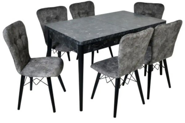 Set masa extensibila cu 6 scaune tapitate Homs cristal negru-gri 170 x 80 cm