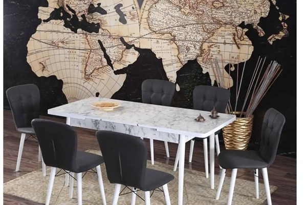 Set masa extensibila cu 6 scaune tapitate Homs marmorat alb 250-30650 bej- negru 170 x 80 cm, un model expansiv pentru casa taAdopta un stil modern in camera de zi cu un Set masa extensibila cu 6 scaune tapitate Homs marmorat alb 250-30650 bej- negru 170 x 80 cm. Acest model este un ansamblu potrivit pentru orice stil decorativ, de la cel clasic, boem, pana la cel modern. Setul Homs iti ofera spatiu suficient pentru 6 persoane, si iti pune la dispozitie o suprafata generoasa de servit masa. Picioarele sunt din lemn si sunt vopsite alb, pentru un contrast placut cu textura blatului marmorat. Blatul este rotunjit la margini, lucru care ii ofera un avantaj in manevrare si curatare. Poti petrece momente placute cu cei dragi, servind noi meniu la aceasta masa de bucatarie eleganta.Dimensiuni:Masa: L 130, l 80, h 75 cmMasa extinsa: L 170, l 80, h 78 cmScaun: L 55, l 55, h 95 cmMese si scaune bucatarie- mai multa functionalitate in bucatarieIndiferent de stilul pe care il preferi, modelul se integreaza de minune in orice ambient. Designul modern si totodata simplu, fac din aceasta masa pentru bucatarie un element ideal pentru orice locuinta. Realizata din pal de 18 mm in nuanta de alb cu gri, masa este foarte utila atat in living, cat si in bucatarie.Poti sa cinezi sau sa faci o aniversare cu membrii familiei si sa va bucurati de un loc perfect pentru dining. Masa de bucatarie se livreaza neasamblata, fiind insotita de schita si accesorii pentru montaj. Montajul se realizeaza de catre beneficiar. Curatarea se face cu o carpa moale alba si produse de curatenie neabrazive specifice tipului de material.Descopera si alte modele de scaune bucatarie, cu tesaturi variate. pentru a adauga o pata de culoare.Vezi mai multe mese bucatarie si inspira-te din gama de produse Homs.