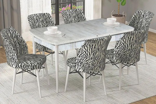 Set masă extensibilă cu 6 scaune tapițate, model zebră Dimensiuni:Masa: L 130, l 80, h 75 cmMasa extinsa: L 170, l 80, h 78 cmScaun: L 56, l 47, h 95 cm