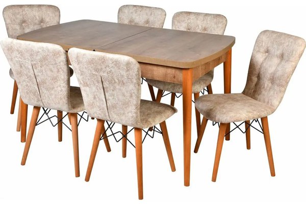 Set masa cu scaune compus din masa extensibila si 6 scaune tapitate cu material textil. Setul este destinat pentru bucatarie, living sau zona speciala de dining. Este un set modern, in culori calde si contrastante cu masa culoarea nucului cu picioare din lemn iar cele 6 scaune sunt tapitate cu material textil usor plusat bej cu picioare din lemn.Masa este confectionata din pal de 18 mm cu picioare din lemn.Se livreaza in toata tara prin curier neasamblate, coletele fiind insotite de schita si accesorii montaj.Asamblarea se face de catre beneficiar.Curatarea cu o carpa alba moale si produse de curatenie neabrazive specifice. Dimensiuni:Masa: L 130, l 80, h 75 cmMasa extinsa: L 170, l 80, h 78 cmScaun: L 47, l 42, h 88 cm