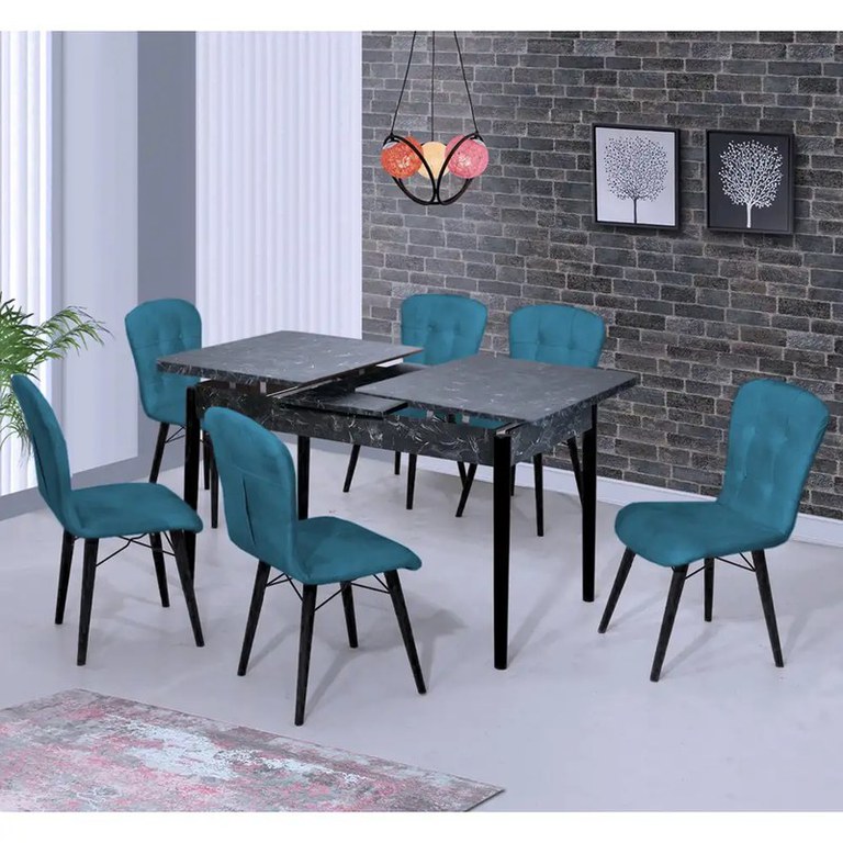Decoreaza-ti casa cu stil cu un Set masa extensibila negru marmorat cu 6 scaune tapitate Beluga TurcoazAcestSet masa extensibila negru marmorat cu 6 scaune tapitate Beluga Turcoaz se pliaza perfect intr-o camera de zi, terasa sau bucatarie.Dimensiuni:Masa: L 130, l 80, h 75 cmMasa extinsa: L 170, l 80, h 78 cmScaun: L 47, l 42, h 88 cmAnsamblul multifunctional poti sa-l amplasezi fie in living, bucatarie sau zona de dining dintr-un open space sau o terasa. Este un set modern, cu masa neagra cu decor tip marmura, ce aduce cu sine mai multa eleganta in camera in care e amenajata. Modelul este completat de picioare din lemn, iar cele 6 scaune sunt tapitate cu material textil turcoaz, cu picioare din acelasi material. Nuanta de turcoaz a tapiteriei cu scaunele pe cadru negru se imbina perfect intr-o casa sofisticata si avangardista.Combinatia de culori este una  antrenanta, creand un dinamism placut in camera. Scaunele au un design ergonomic si prin curbura spatarului urmaresc linia spatelui. Materialul de la tapiteria scaunelor este unul placut si fin care se potriveste si celor mai pretentioase gusturi.Masa iti ofera marele avantaj ca poti economisi spatiu in camera, iar can ai aniversari in familie, sau seri cu cei dragi, poti extinde blatul rapid.Masa este confectionata din pal de 18 mm cu picioare din lemn.Se livreaza in toata tara prin curier neasamblate, coletele fiind insotite de schita si accesorii montaj.Asamblarea se face de catre beneficiar.Curatare produse de curatenie neabrazive specifice. Masa :Marmura NegruScaune : turcoaz- cobalt blue- textil