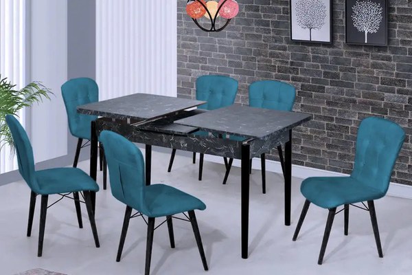 Set masa extensibila negru marmorat cu 6 scaune tapitate Beluga culoare turcoaz