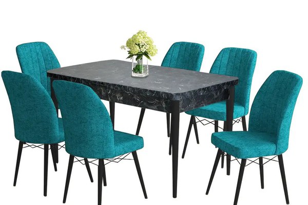 Set masa extensibila negru marmorat cu 6 scaune tapitate Cargold Turcoaz