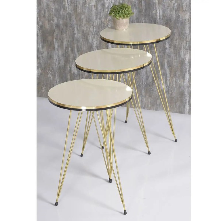 Set masuta de cafea Homs, 3 buc Dimensiuni:Masuta 1: L:34, h 55 cmMasuta 2: L:34, h 51 cmMasuta 3: L:34 h 47 cmSet format din 3 bucati de mesepicioare de metal