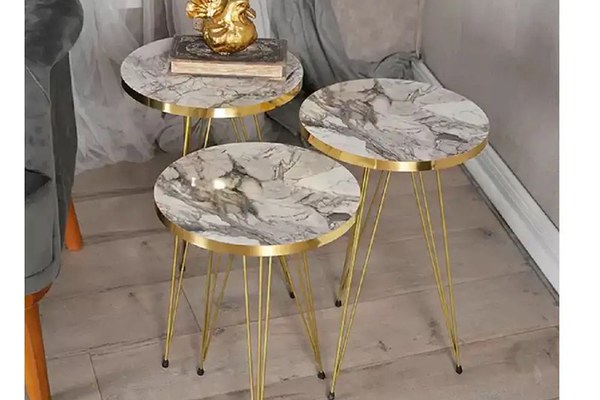 Set masuta de cafea Homs, 3 buc Dimensiuni:Masuta 1: L:38, h 56 cmMasuta 2: L:38, h 52 cmMasuta 3: L:38 h 48 cmSet format din 3 bucati de meseblat pal 18 mm, picioare metal vopsit auriu