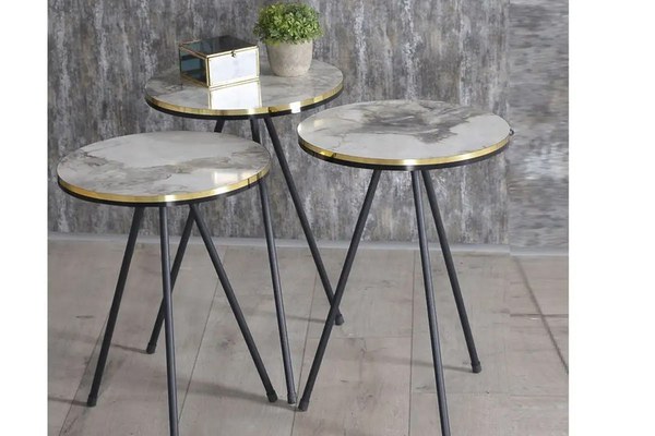 Set masuta de cafea Homs, 3 buc Dimensiuni:Masuta 1: R:34, h 52 cmMasuta 2: R:34, h 49 cmMasuta 3: R:34 h 46 cmSet format din 3 bucati de mesepicioare de metal