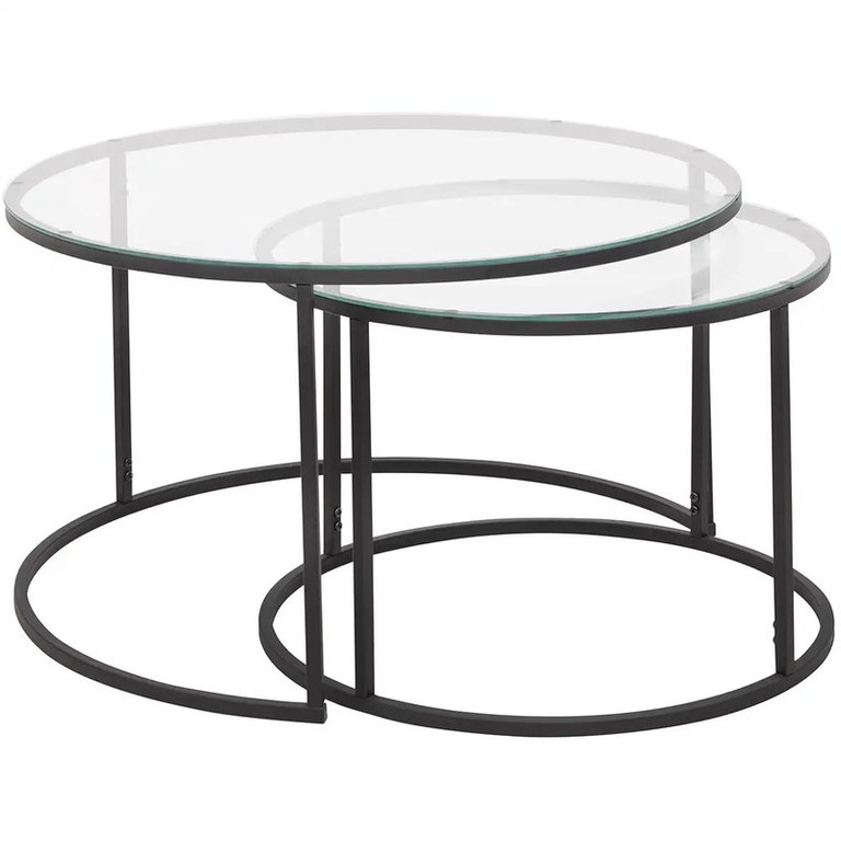 Dimensiuni și caracteristici:Masuța 1: Diametru: 80 cm, Înălțime: 45 cmMasuța 2: Diametru: 60 cm, Înălțime: 40 cmMaterial: Sticlă și metal pentru picioare