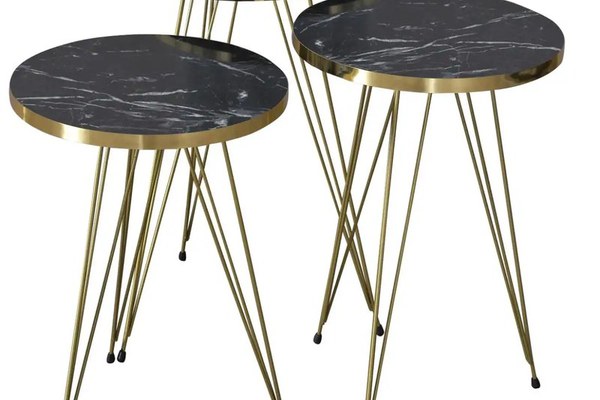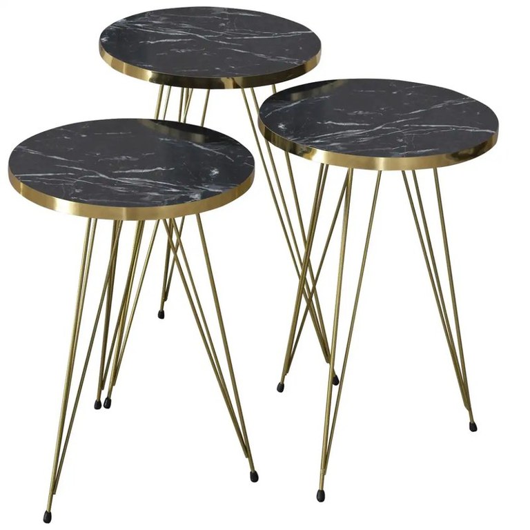 Set măsuțe de cafea Homs – Eleganță contemporană în 3 dimensiuniAdaugă un plus de stil și funcționalitate spațiului tău cu setul de măsuțe de cafea Homs, format din 3 piese cu un design modern și sofisticat. Blatul negru elegant, combinat cu picioarele metalice aurii, conferă un contrast rafinat și un aspect contemporan care se potrivește perfect în orice living.Caracteristici principale:Set complet: 3 măsuțe de dimensiuni diferite, ideale pentru a fi folosite împreună sau separatDesign elegant: blat rotund negru, cu detalii fine și finisaj matPicioare aurii din metal: oferă stabilitate și un look glam modernConstrucție durabilă: materiale rezistente și ușor de întreținutDimensiuni:Măsuță 1: diametru 33,8 cm, înălțime 52 cmMăsuță 2: diametru 33,8 cm, înălțime 49 cmMăsuță 3: diametru 33,8 cm, înălțime 46 cmPerfecte pentru cafea, decor sau ca suport pentru obiecte, aceste măsuțe versatile se integrează ușor în orice decor modern sau minimalist.