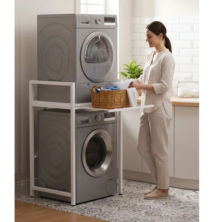 Suport raft pentru mașină de spălat și uscător cu sertar,alb
