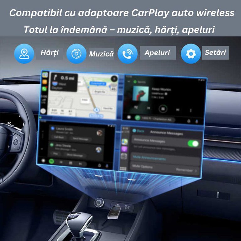 Adaptor Auto 2 in 1 CarPlay Wireless – Modulator FM Multifunctional Transforma-ti fiecare drum intr-o experienta inteligenta si relaxanta cu Adaptorul Auto 2 in 1 CarPlay Wireless – solutia perfecta pentru cei care vor confort, conectivitate si siguranta la volan! Conectivitate Universala – Compatibil cu telefoane iPhone si Android, acest adaptor se conecteaza rapid si usor prin CarPlay Wireless sau Android Auto, oferindu-ti acces direct la muzica, apeluri, mesaje, Waze, Google Maps si multe altele, fara fir! Modulator FM Integrat – Reda muzica preferata prin sistemul audio al masinii, chiar daca aceasta nu dispune de Bluetooth. Doar alegi frecventa si porneste distractia! Incarcare Rapida Duala – Cu porturi USB normal si Type-C, iti poti incarca simultan doua dispozitive, astfel incat tu si pasagerii sa fiti mereu conectati. Reconectare Automata – Dupa prima utilizare, adaptorul se reconecteaza automat la telefonul tau, fara nicio bataie de cap. Instalare Simpla, Fara Efort – Se monteaza in cateva secunde, fara cabluri incurcate sau unelte speciale. Tot ce trebuie sa faci este sa-l introduci in bricheta auto! Ideal pentru cei care vor sa-si modernizeze rapid masina, fara modificari costisitoare! Vrei o experienta auto mai smart? Alege Adaptorul CarPlay Wireless 2 in 1 si bucura-te de libertate, confort si tehnologie in fiecare calatorie!