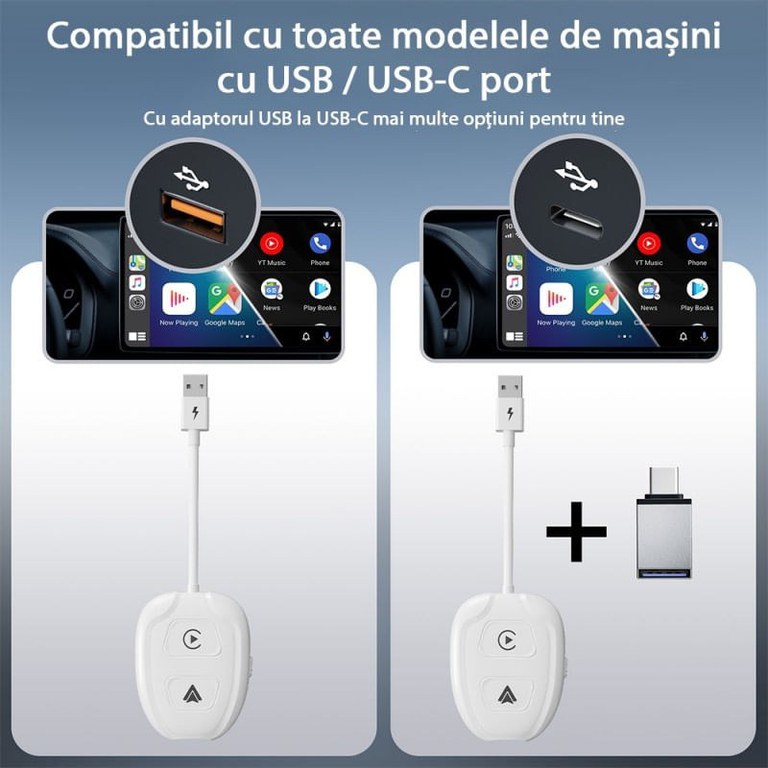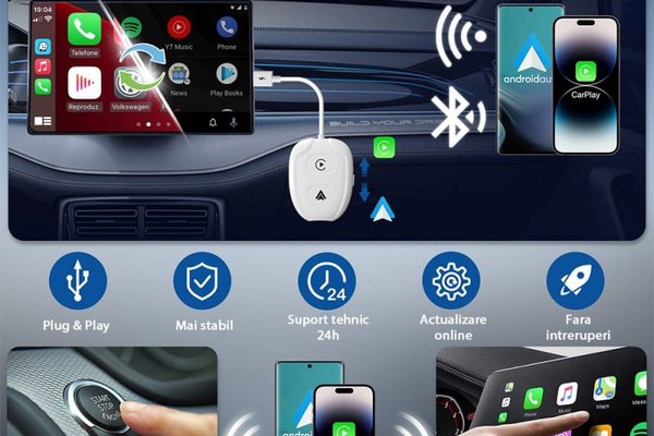 Cu adaptorul wireless Techstar® THT-020-9-1, puteti extinde functionalitatea radioului dvs. autoradio cu sistem de operare 11.0 si mai mare pentru a conecta fara fir si wireless telefoane mobile si tablete folosind Apple Car Play pentru iOS si Android Auto pentru Android. Cu aceasta extensie, puteti vizualiza harti, reda si controla muzica, stirile, podcasturile si cartile audio direct pe autoradio. În plus, adaptorul suporta si mirroring-ul dispozitivului conectat pe display-ul sistemului stereo auto.Chiar daca este un adaptor universal, este o conditie prealabila pentru functionalitate în primul rând pentru a verifica compatibilitatea radioului auto. Unitatea este potrivita pentru marea majoritate a radiourilor auto care ruleaza Android versiunea 11.0 si mai sus. Puteti afla acest lucru direct din meniul radio sau puteti verifica la dealerul auto. Aceasta unitate nu este***nu este potrivita****pentru radiourile auto fara sistem de operare*, cum ar fi. radiouri auto originale Skoda si VW etc..Functia Android Auto se gaseste chiar în meniul telefonului dumneavoastra. Unitatea poate comunica cu telefoanele sistemul de operare Android versiunea 11.0 si superioara. Pro utilizarea AppleCarPlay necesita ca iPhone-ul tau sa ruleze iOS 12 sau o versiune mai recenta.Este usor sa începeti. Trebuie doar sa conectati unitatea din masina la conectorul USB. Gaseste ES APK pe unitate si ruleaza. Aplicatia este instalata în radioul masinii si sunteti gata de plecare.Conectarea telefonului la unitate este posibila utilizând reteaua WiFi generata de unitate sau direct prin cablu. Atunci când utilizati un cablu, asigurati-va ca cablul pe care îl utilizati pentru a va conecta telefonul este fie original, fie de înalta calitate. Cu unele cabluri neoriginale, este posibil ca unitatea sa nu fie functionala!Caracteristici:Dispozitiv suplimentar pentru extinderea functiilor radioului auto AndroidSuport pentru oglindirea ecranuluiSuport CarPlaySuport Android Autosuport tel. suna laCablu de conectivitate sau WiFiAplicatie încarcata direct în adaptorSpecificatii:Tip: Carplay dongleMaterial: ABSUpgrade: Upgrade onlineSistem de operare: Pentru Apple carplay, pentru Android AutoHarta compatibila: Pentru Google, pentru WAZE, pentru AmapModele de telefoane compatibile: Pentru iPhoneX / 8 / 8Plus / 7 / 7Plus / 6s / 6splus / 6 / 6plus, pentru telefon AndroidCerinta pentru stereo auto: Pentru versiunea Android 11.0 sau superioaraControl vocal: Muzica/Nagivation/Siri, etc.Alta functie: Pentru Carplay, Carlife, pentru Android Auto, Ecran mobil, etc.Greutate neta: 50 gGreutate bruta: 70 gDimensiune ambalat: 13 x 7 x 2 cmCuloare: albPachetul include:1 x Adaptor wireless1 x Manual utilizare