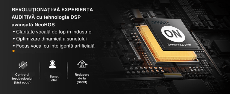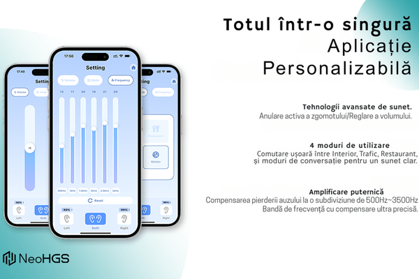Aparat din Linia Premium NeoSound HGS reprezinta varful tehnologiei noastre in domeniul aparatelor auditive. Conceput pentru utilizatorii exigenti, acest model ofera un sunet clar, natural si fara distorsiuni, intr-un design compact, discret si extrem de confortabil pentru purtare zilnica. NeoSound HGS Premium este un aparat auditiv digital de clasa, proiectat pentru persoanele cu deficiente de auz, nu un simplu amplificator de sunet de calitate inferioara. Dotat cu procesor digital avansat, filtre inteligente si tehnologii de compensare a pierderii auditive, acest dispozitiv ofera o auditie clara, naturala si personalizata. Dotat cu cel mai avansat procesor de semnal digital, NeoSound HGS Premium elimina zgomotele nedorite si optimizeaza sunetul in functie de mediul inconjurator. Sistemul sau inovator cu difuzor integrat in corpul principal si transmisie prin canal de aer ofera o experienta auditiva superioara fata de modelele clasice cu casca interna. Aparatele auditive NeoSound HGS Premium pot fi utilizate atat impreuna cu aplicatia mobila dedicata (pentru Android si iOS), cat si complet independent, fara a necesita conectare la telefon. Toate functiile esentiale sunt disponibile direct pe fiecare aparat, ceea ce le face usor de utilizat si pentru persoanele care nu folosesc smartphone-uri. Caracteristici principale: Sunet clar, fara interferente: Filtru anti-ecou si tehnologie de reducere a microfoniei pentru confort auditiv fara tiuieli neplacute. Amplificator digitala: Calitate sonora exceptionala, cu zgomot de fond redus. Protectie automata la zgomote puternice: Ajusteaza instantaneu volumul pentru a proteja auzul. 4 moduri de ascultare inteligente: Standard, Reducere Zgomot, Sala, Aer Liber – adaptabile la orice mediu. Pornire/Oprire automata: Functioneaza automat cand sunt scoase din cutie si se opresc la reincarcare. Control prin aplicatie mobila: Compatibila cu Android si iOS, pentru reglaje personalizate in functie de nevoile fiecarui ureche. Prindere sigura si confortabila: Sistemul Concha Lock (dezvoltat de Siemens) ofera fixare stabila, fara disconfort. Autonomie extinsa: Cutia de incarcare portabila permite pana la 3 reincarcari fara priza , total 90 de ore. Specificatii tehnice: Volum maxim: 110 ± 5 dB Amplificare sunet: 33 ± 4 dB Distorsiuni armonice: < 3% Frecventa de raspuns: 200 Hz – 5000 Hz Continutul pachetului: 2x aparate auditive reincarcabile (stanga + dreapta) 4 perechi de dopuri auriculare (oliva), marimi diferite 1x cutie de incarcare si depozitare 1x incarcator de priza 1x manual de utilizare NeoSound HGS Premium – tehnologie auditiva de top, discreta si intuitiva, creata pentru a imbunatati calitatea vietii in fiecare zi.