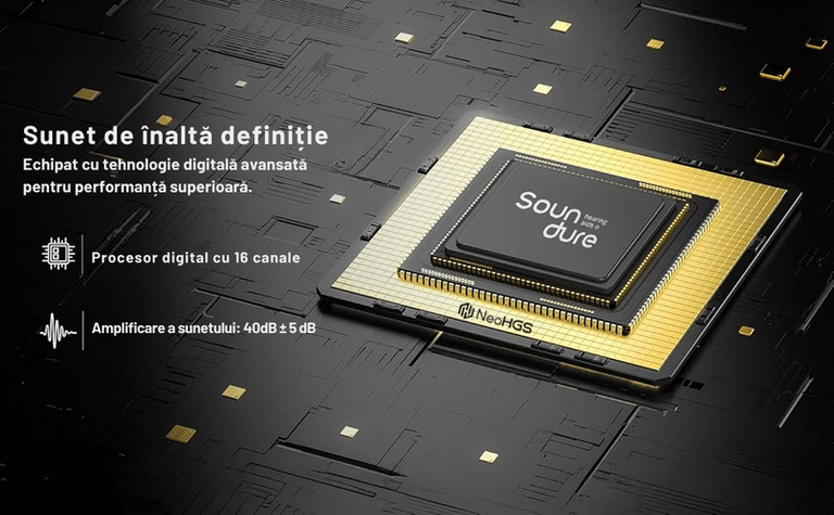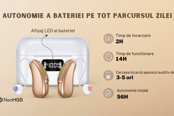Aparat Auditiv Reincarcabil Digital x2 NeoHGS Premium, Sunet Clar, Hands-Free, Bluetooth, Incarcare Rapida, Operare Simpla, Design Modern, Ecran Baterie Carcasa, Hands-Free Garantie 24 de Luni. Aparat din Linia Premium NeoSound HGS reprezinta varful tehnologiei noastre in domeniul aparatelor auditive. Conceput pentru utilizatorii exigenti, acest model ofera un sunet clar, natural si fara distorsiuni, intr-un design compact, discret si extrem de confortabil pentru purtare zilnica. Puteti asculta muzica, raspunde la apeluri telefonice Hands-Free si primi sunet direct in aparatul auditiv. NeoSound HGS Premium este un aparat auditiv digital de clasa, proiectat pentru persoanele cu deficiente de auz, nu un simplu amplificator de sunet de calitate inferioara. Dotat cu procesor digital avansat, filtre inteligente si tehnologii de compensare a pierderii auditive, acest dispozitiv ofera o auditie clara, naturala si personalizata. Dotat cu cel mai avansat procesor de semnal digital, NeoSound HGS Premium elimina zgomotele nedorite si optimizeaza sunetul in functie de mediul inconjurator. Sistemul sau inovator cu difuzor integrat in corpul principal si transmisie prin canal de aer ofera o experienta auditiva superioara fata de modelele clasice cu casca interna. Aparatele auditive NeoSound HGS Premium pot fi utilizate atat impreuna cu aplicatia mobila dedicata (pentru Android si iOS), cat si complet independent, fara a necesita conectare la telefon. Toate functiile esentiale sunt disponibile direct pe fiecare aparat, ceea ce le face usor de utilizat si pentru persoanele care nu folosesc smartphone-uri. Baterie Reincarcabila si Cutie de Incarcare Magnetica Spuneti adio bateriilor de unica folosinta! Fiecare incarcare ofera pana la 16 ore de utilizare continua. Cutia portabila de incarcare magnetica functioneaza si ca power bank, oferind 2–3 incarcari suplimentare si peste 50 de ore de rezerva. Control prin Aplicatie Bluetooth pentru Personalizare Conectati-le usor la smartphone-uri, inclusiv iPhone-uri, prin Bluetooth. Aplicatia Soundure permite reglarea volumului, schimbarea modurilor si ajustarea frecventelor conform nevoilor dumneavoastra auditive. Caracteristici principale: ? Sunet clar, fara interferente: Filtru anti-ecou si tehnologie de reducere a microfoniei pentru confort auditiv fara tiuieli neplacute. ? Amplificator digitala: Calitate sonora exceptionala, cu zgomot de fond redus. ?️ Protectie automata la zgomote puternice: Ajusteaza instantaneu volumul pentru a proteja auzul. ⚙️ 4 moduri de ascultare inteligente: Standard, Reducere Zgomot, Sala, Aer Liber – adaptabile la orice mediu. ? Pornire/Oprire automata: Functioneaza automat cand sunt scoase din cutie si se opresc la reincarcare. ? Control prin aplicatie mobila: Compatibila cu Android si iOS, pentru reglaje personalizate in functie de nevoile fiecarui ureche. ? Prindere sigura si confortabila: Sistemul Concha Lock (dezvoltat de Siemens) ofera fixare stabila, fara disconfort. ? Autonomie extinsa: Cutia de incarcare portabila permite pana la 3 reincarcari fara priza , total 90 de ore. Specificatii tehnice: Volum maxim: 110 ± 5 dB Amplificare sunet: 40 ± 4 dB Distorsiuni armonice: < 3% Frecventa de raspuns: 200 Hz – 5000 Hz Continutul pachetului: 2x aparate auditive reincarcabile (stanga + dreapta) 6 perechi de dopuri auriculare (oliva), marimi diferite 1x cutie de incarcare si depozitare 1x incarcator de priza 1x manual de utilizare NeoSound HGS Premium – tehnologie auditiva de top, discreta si intuitiva, creata pentru a imbunatati calitatea vietii in fiecare zi.
