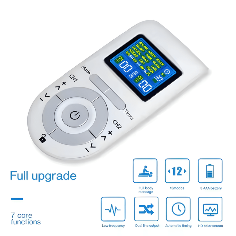 Experimentati o solutie versatila si eficienta pentru ameliorarea durerii si relaxare cu aparatul de masaj cu electrostimulare pentru fizioterapie/electroterapie BLEKSY®. Acest dispozitiv 3 in 1 integreaza tehnologiile TENS, EMS si functia de masaj pentru a sprijini gestionarea diverselor afectiuni musculare si relaxarea generala a corpului. Tehnologia TENS (Stimulare Nervosa Electrica Transcutanata) este recunoscuta pentru capacitatea de a reduce durerea si spasmele musculare. Aceasta este eficienta pentru tratarea durerilor de gat, spate, genunchi, artrita, durerilor menstruale sau leziunilor sportive. Tehnologia EMS (Stimulare Electrica a Muschilor) provoaca contractii musculare, ajutand la imbunatatirea fortei si a rezistentei, fiind utila in antrenamente de forta si recuperare. Pe langa aceste functii terapeutice, modulul de masaj relaxeaza muschii si elimina oboseala acumulata. BLEKSY® vine echipat cu doua canale independente (A/B), fiecare canal permitand conectarea a 4 electrozi, ceea ce ofera posibilitatea tratarii simultane a doua zone diferite ale corpului, fiecare cu intensitate si moduri distincte. Functia de memorie pastreaza setarile preferate pentru acces rapid, iar functia de blocare impiedica modificarile accidentale in timpul utilizarii. Setul complet include: Aparatul electronic de masaj BLEKSY® cu 12 programe diferite de masaj si 30 de niveluri de intensitatepentru fiecare canal individual. 4 electrozi reutilizabili pentru aplicatii multiple. 2 cabluri duble pentru conectarea electrozilor. Manual de instructiuni detaliat pentru utilizare sigura si eficienta. Utilizarea dispozitivului este simpla si intuitiva datorita butoanelor clar etichetate si modurilor vizibile pe panoul frontal. Ecranul LCD iluminat din spate si pictogramele marite imbunatatesc vizibilitatea si usurinta de utilizare. Pentru o experienta sigura, sunt incluse masuri de precautie detaliate, asigurandu-va ca utilizati aparatul in mod corect. Este esential sa consultati un medic inainte de utilizare daca aveti afectiuni medicale preexistente sau dispozitive implantate, precum stimulator cardiac. Contraindicatii: Evitati folosirea in zona inimii sau pe rani deschise si afectiuni severe ale pielii. Nu utilizati daca suferiti de aritmii, boli maligne, febra sau afectiuni inflamatorii. Persoanele cu stimulator cardiac sau alte dispozitive electronice implantate nu trebuie sa foloseasca acest aparat. Nu aplicati electrozii prelungit pe aceeasi zona pentru a preveni iritarea pielii. Nu utilizati dispozitivul in timpul somnului, la volan sau in baie. Evitati expunerea la conditii extreme de umiditate sau medii inflamabile. BLEKSY® este conceput pentru a oferi o solutie completa de ameliorare a durerii si promovare a relaxarii, fiind partenerul ideal pentru sanatatea si starea dumneavoastra de bine. Utilizati intotdeauna produsul in conformitate cu recomandarile si consultati un specialist in caz de incertitudini privind aplicarea acestuia.
