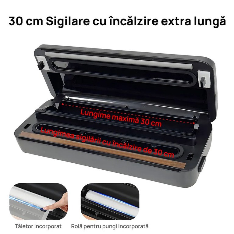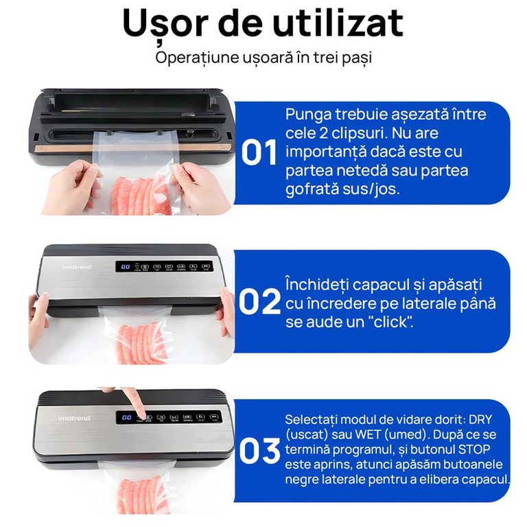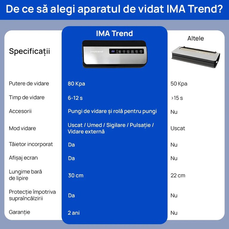 Etansare eficienta, control digital si versatilitate completa/nAparatul de vidat IMA Trend cu 80kpa este aliatul ideal pentru conservarea alimentelor si a lichidelor in sticle sau recipiente. Dotat cu cutter, furtun pentru vidare externa si panou de comanda tactil, acest model ofera o experienta completa si profesionala./nPachetul contine 10 pungi si o rola de 25cm x 500 cm, astfel incat il poti folosi imediat pentru congelare, sous-vide sau organizare in bucatarie./n⸻/n✔️ Beneficii:• Presiune puternica de vidare: 80kpa• Furtun inclus – perfecte pentru vidare recipiente/sticle• 5 moduri de lucru: vidare umed, uscata, soft, automata, doar sigilare• Cutter incorporat – taiere personalizata a pungilor• Bara de lipire 30cm – pentru sigilare larga• Panou tactil modern si intuitiv• Reduce risipa alimentara si prelungeste prospetimea/n⸻/n✔️ Recomandat pentru:• Carne, peste, branzeturi, fructe, legume• Sticle de vin, recipiente sous-vide sau conserve• Frigider, congelator, depozitare pe termen lung• Meal prep si organizare inteligenta/n⸻/n✅ Specificatii:• Putere: 130W• Presiune: 80kpa• Functii: vidare uscata, umeda, soft, sigilare, automata• Bara de lipire: 30cm• Cutter: Da, incorporat• Furtun pentru sticle: inclus• Panou de control: tactil• Pungi incluse: 10 buc (15x20cm)• Rola inclusa: 1 buc (25x500cm)• Culoare: Gri + Negru/n/n/n/n/n/n/n/n/n/n/n/n/n/n/n/n