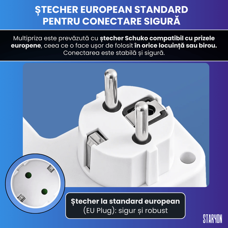 Ai nevoie de o solutie moderna, sigura si multifunctionala pentru alimentarea aparatelor electrice si a device-urilor tale?Blocul multipriza Staryon® combina 4 prize Schuko standard cu porturi USB-A si USB-C, oferind atat putere, cat si versatilitate./nCu protectie avansata la supratensiune, materiale ignifuge si intrerupatoare individuale, acest dispozitiv este conceput pentru siguranta, confort si eficienta maxima in orice spatiu – acasa, la birou sau in calatorii./nIata de ce merita achizitionat:/n✅ Putere si siguranta intr-un singur produsBlocul multipriza are o capacitate maxima de 2500W, suficienta pentru a alimenta simultan electrocasnice, echipamente de birou sau gadgeturi personale.Protectia la supratensiune si materialul ignifug garanteaza utilizare sigura in orice context./n✅ Stecher european pentru conectare siguraMultipriza este prevazuta cu stecher Schuko standard, ceea ce inseamna ca poate fi folosita imediat in orice priza europeana.Conexiunea este stabila si ferma, fara adaptori suplimentari./n✅ 3 porturi USB pentru incarcare rapida a dispozitivelor mobileBlocul multipriza Staryon® integreaza doua porturi USB-A si un port USB-C, oferind o solutie moderna pentru incarcarea simultana a telefoanelor, tabletelor, castilor wireless si altor gadgeturi portabile./n/n/nPortul USB-C este compatibil cu cele mai noi modele de smartphone si tableta, asigurand incarcare mai rapida si mai eficienta.In acest fel, economisesti prizele clasice Schuko pentru electrocasnice si aparate mai mari, pastrand in acelasi timp conectate si incarcate device-urile mobile.Aceasta functie elimina nevoia de incarcatoare separate si cabluri suplimentare, mentinand spatiul de lucru mai organizat si curat./n✅ Protectie avansata la supratensiune si supraincalzireMultipriza este echipata cu un sistem de protectie inteligent care asigura siguranta maxima pentru toate echipamentele conectate./nIn cazul fluctuatiilor de tensiune, mecanismul blocheaza instantaneu suprasarcina, prevenind deteriorarea electrocasnicelor, a computerelor sau a altor device-uri sensibile./n/n/nMaterialul ignifug din care este fabricata carcasa rezista la temperaturi ridicate, reducand riscul de incendiu.In plus, functia de oprire automata in situatii de supraincalzire ofera un nivel suplimentar de siguranta, facand produsul potrivit chiar si pentru utilizarea continua in birouri sau locuinte./n✅ Prize europene standard SchukoCele 4 prize Schuko sunt ideale pentru conectarea electrocasnicelor si a altor echipamente electrice.Sunt rezistente, stabile si sigure, oferind o prindere ferma fara riscul scanteilor sau al contactului imperfect./n✅ Intrerupatoare individuale pentru economie de energieFiecare dintre cele 4 prize Schuko este prevazuta cu intrerupator propriu, iluminat discret, care iti permite sa opresti alimentarea doar pentru dispozitivele pe care nu le folosesti./n/n/nAceasta functie contribuie la reducerea consumului de energie, evitand pierderile cauzate de aparatele lasate in stand-by./nIn plus, intrerupatoarele individuale prelungesc durata de viata a aparatelor conectate si iti ofera control total asupra alimentarii.Practic, nu mai esti nevoit sa scoti mereu cablurile din priza, ci poti gestiona alimentarea printr-o simpla apasare de buton, rapid si eficient./n✅ Compatibilitate universalaProdusul este ideal pentru utilizarea cu electrocasnice, laptopuri, PC-uri, routere, televizoare sau orice alt device electric sau electronic.Este gandit sa acopere atat nevoile casnice, cat si pe cele de birou./n✅ Dimensiuni compacte, design slimCu dimensiuni de doar 234 × 74 × 37 mm, multipriza are un design slim care economiseste spatiu si se integreaza perfect pe perete sau langa birou.Este usoara si practica, potrivita chiar si pentru spatii restranse./n✅ Material ignifug si constructie rezistentaFabricat din plastic PC ignifug si cu contacte interne din fosfor-bronz, multipriza este construita pentru durabilitate si siguranta pe termen lung.Rezista la utilizare zilnica si la temperaturi ridicate./n✅ Specificatii tehnice:/n/nProdus: Bloc multipriza Staryon/nPutere maxima: 2500W/nPrize: 4x Schuko europene/nPorturi: 2x USB-A, 1x USB-C/nProtectie: supratensiune, supraincalzire/nIntrerupatoare: individuale, cu indicator luminos/nMaterial: PC ignifug, contacte fosfor-bronz/nDimensiuni: 234 × 74 × 37 mm/nFunctii suplimentare: lumina de noapte, design slim compact/nCuloare: alb/n/nBlocul multipriza Staryon® imbina perfect puterea, siguranta si functionalitatea moderna.Cu 4 prize Schuko, porturi USB-A si USB-C, protectie la supratensiune, materiale ignifuge si design compact, ofera solutia completa pentru alimentarea tuturor aparatelor si device-urilor tale./nAlege acum un produs multifunctional, sigur si elegant, ideal pentru casa sau birou!/n
