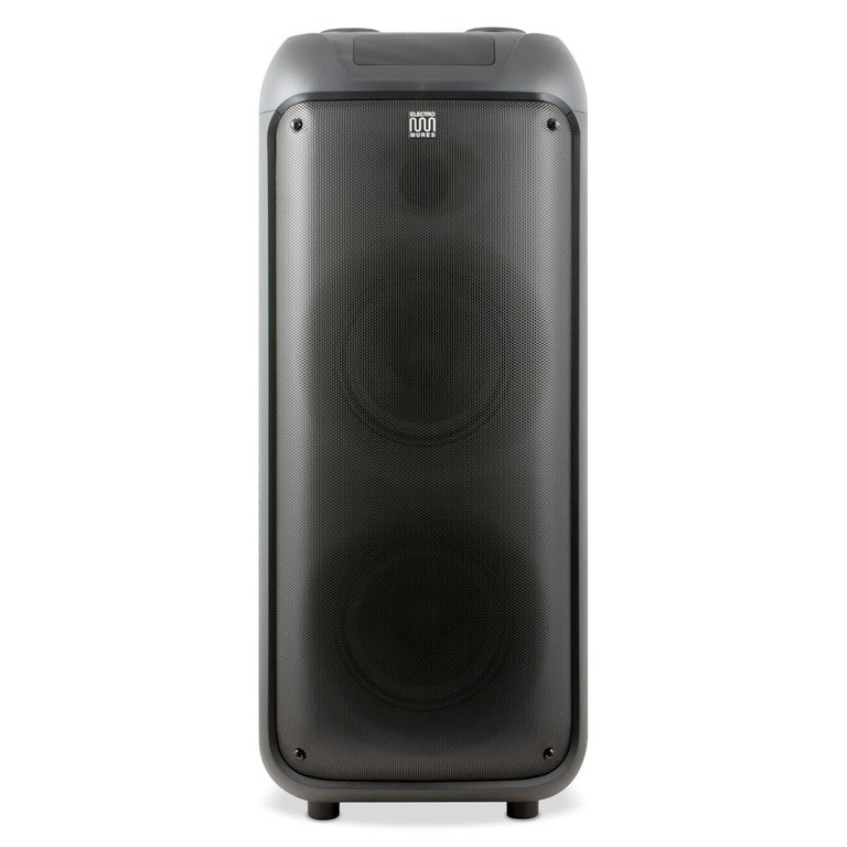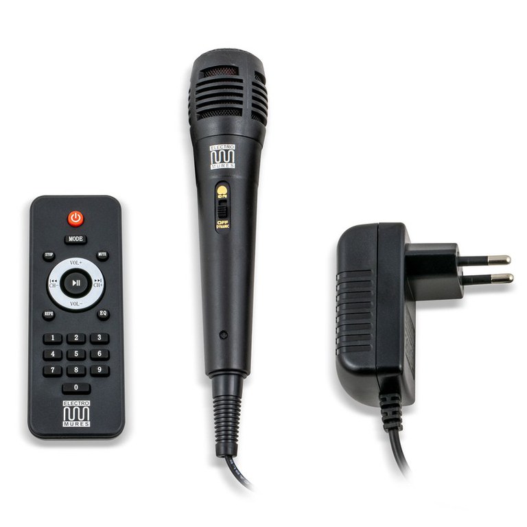 Boxa portabila Bluetooth cu microfon si telecomanda Electromures EM 1008, 40 W, Baterie reincarcabila incorporata 3600 mAh, Autonomie 6 h, Port USB, Port mini jack, Functie radio, LED, Negru/nFunctii principale: BT, AUX, USB, TF, FM, MIC, LED, Display, Treble, Bass, Echo, Full LED Light, TWS./nTelecomanda./nBaterie reincarcabila incorporata (7,4 V, 3600 mAh)./nIncarcare prin adaptorul inclus (DC9V 1.5A)./nIntrare mini jack de 3,5 mm (AUX)./nPort USB si slot TF, permite redarea fisierelor MP3, WMA, WAV si FLAC./nRadio FM cu frecventa 87,5-108 MHz./nIntrare microfon cu fir (microfon cu fir inclus)./nLumini LED colorate (7 moduri)./nVersiunea BT: 5.3 (frecventa nominala: 2,4 Ghz)./nDistanta transmisie Bluetooth: maxim 10 m./n2 difuzoare de 16,5 cm (6,5 inchi) + difuzor inalte./nPutere amplificator: 40W./nTensiune nominala: 9V./nRaportul semnal/zgomot ≥ 65dB.