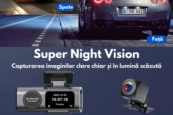 Camera Auto Dubla 4K Ultra HD cu Wi-Fi, GPS si Super Night Vision – Protectie Completa si Monitorizare Avansata Transforma-ti experienta de condus si asigura-te ca fiecare calatorie este inregistrata la cea mai inalta calitate. Aceasta camera auto dubla este un partener indispensabil pentru orice sofer care doreste siguranta, confort si control deplin asupra drumului. Echipata cu tehnologie de ultima generatie, aceasta camera ofera o gama larga de functii menite sa protejeze si sa optimizeze experienta ta de condus. Caracteristici Tehnice Avansate Rezolutie 4K Ultra HD (3840 x 2160p): Camera frontala capteaza imagini extrem de clare si detaliate, ideale pentru identificarea numerelor de inmatriculare, semnelor de circulatie si altor elemente importante. Camera din spate, cu rezolutie 1080P (1920 x 1080p), completeaza perfect sistemul, oferind o vedere completa in orice directie. Ecran IPS de 2 inch: Vizualizeaza inregistrarile si setarile direct pe ecranul clar si luminos, cu un unghi de vizualizare larg, optim pentru ajustari rapide. Functie de Conectivitate Wi-Fi: Acceseaza inregistrarile direct de pe telefonul mobil, fara a scoate cardul de memorie. Aplicatia intuitiva iti permite sa descarci fisiere, sa le partajezi sau sa personalizezi setarile camerei din cateva atingeri. Mod GPS Integrat: Inregistreaza traseul exact al fiecarei calatorii, impreuna cu datele de viteza si locatie, oferind dovezi incontestabile in caz de incidente. Tehnologie Super Night Vision: Cu o diafragma F2.0 si tehnologie WDR (Wide Dynamic Range), camera ofera imagini clare si luminoase chiar si in conditii de lumina scazuta sau noapte, eliminand reflexiile si umbrele. Unghi de Vizualizare de 170° (fata) si 140° (spate): Asigura o acoperire extinsa a drumului si elimina unghiurile moarte, pentru o siguranta sporita. Monitorizare Parcare 24/7: Protejeaza-ti vehiculul chiar si cand este stationat. Modul Time-Lapse si senzorul G detecteaza si inregistreaza orice impact sau miscare neasteptata. ( Kit parcare nu este inclus ). Inregistrare in Bucla: Tehnologia avansata previne pierderea de date, inlocuind automat cele mai vechi inregistrari atunci cand cardul de memorie este plin, asigurand captarea continua a fiecarui moment. Blocare de Urgenta cu Senzor G: Detecteaza automat impacturile si blocheaza fisierele critice pentru a preveni stergerea accidentala, oferind o dovada esentiala in caz de coliziune. Design Compact si Materiale Premium: Construita din materiale durabile si rezistente la temperaturi extreme, camera se integreaza discret in interiorul masinii tale. Avantaje pentru Soferi Siguranta si Control: Monitorizarea constanta te ajuta sa te simti protejat in orice situatie, fie pe drum, fie in parcare. Economie de Timp si Bani: In caz de accidente, dovezile video te pot ajuta sa eviti litigiile si sa rezolvi mai rapid cererile de asigurare. Confort in Utilizare: Interfata intuitiva si aplicatia mobila fac configurarea si accesarea datelor extrem de simple. Ideala pentru Calatorii: GPS-ul integrat si claritatea imaginilor transforma aceasta camera intr-un companion de incredere pentru drumuri lungi. Pachetul Include 1x Camera frontala 4K Ultra HD 1x Camera spate 1080P 1x Modul GPS pentru monitorizare trasee 1x Card SD de 32GB inclus 1x Cablu de alimentare lung pentru o instalare flexibila 1x Incarcator auto De ce sa Alegi Aceasta Camera? Aceasta camera auto nu este doar un gadget, ci o investitie in siguranta ta si a familiei tale. Tehnologiile avansate, materialele premium si functiile complete o fac potrivita atat pentru soferii obisnuiti, cat si pentru cei care calatoresc frecvent.