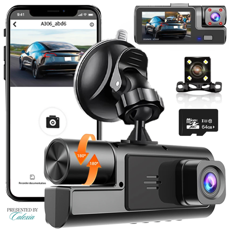 Camera auto tripla de bord Full HD 1080P, GoSafe, WDR, GPS, WIFI, aplicatie pe telefon, night vision, card 64 GB inclus