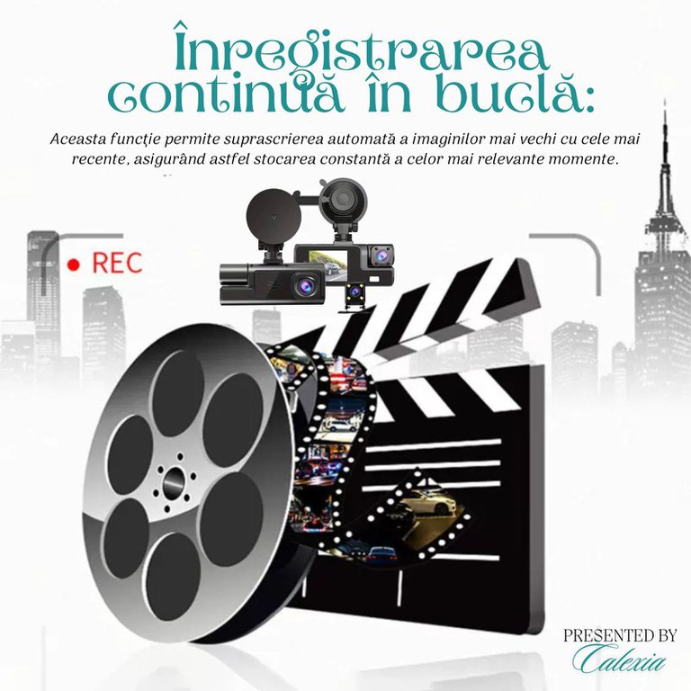 Cameră Auto Triplă de Bord – Monitorizare Completă Față, Spate și Cabină, cu Card de 64 GB Inclus/nDescoperă performanța de varf a Camerei Auto Triple de Bord, proiectată să ofere o monitorizare completă și o protecție sporită pe drum. Această cameră avansată oferă captură video de inaltă definiție din față, spate și interiorul vehiculului, ideală pentru șoferii de ride-sharing, taxiuri sau utilizare personală. Cu un card de memorie de 64 GB inclus, iți asigură suficient spațiu pentru stocarea tuturor inregistrărilor importante./n/nCaracteristici Detaliate:/n1. Monitorizare pe 3 Canale cu Lentile Multiple/nAcest model dispune de 3 lentile care funcționează simultan pentru a acoperi toate unghiurile posibile. Camera frontală surprinde detalii clare din trafic, in timp ce camera din spate oferă o acoperire suplimentară pentru protecția vehiculului tău. Camera din cabină este perfectă pentru inregistrarea interacțiunilor cu pasagerii, fiind o alegere excelentă pentru șoferii de taxi sau ride-sharing./n/n2. Calitate Superioară Full HD/nLentila principală frontală filmează la Full HD 1080p, oferind o calitate clară și detalii fine, chiar și in condiții de luminozitate redusă. Cu un unghi larg de 170°, camera asigură o vedere panoramică, reducand unghiurile moarte și surprinzand tot ce se intamplă in jurul vehiculului./n3. Funcție Avansată de Vedere Nocturnă/nDatorită tehnologiei de infraroșu și lentilelor optimizate, camera oferă o performanță excelentă și pe timp de noapte. Fie că te afli pe drumuri slab iluminate sau conduci pe timp de noapte, vei beneficia de imagini clare și vizibile in orice moment./n/n4. Card de Memorie de 64 GB Inclus/nCu cardul de memorie de 64 GB inclus, iți poți stoca toate inregistrările importante fără grija de a rămane fără spațiu. Camera suportă și carduri microSD de pană la 128 GB, oferind o flexibilitate sporită pentru stocare. Funcția de inregistrare ciclică rescrie automat cele mai vechi fișiere, asigurand că ai intotdeauna acces la cele mai recente clipuri video./n5. Senzor G și Detectare Automată a Coliziunilor/nSenzorul G incorporat detectează automat coliziunile și franările bruște, declanșand imediat inregistrarea și salvarea fișierelor critice. Această funcție previne pierderea datelor esențiale in caz de accident și asigură dovezi clare in cazul unui eveniment rutier neprevăzut./n/n6. Monitorizare a Parcării 24/7/nChiar și atunci cand vehiculul tău este parcat, camera rămane activă datorită funcției de monitorizare a parcării. In cazul in care detectează o mișcare sau o lovitură, camera pornește automat și inregistrează evenimentul, oferindu-ți protecție continuă./n/n7. Tehnologie de Stocare și Compresie Optimizată/nCamera dispune de funcții avansate de compresie video, maximizand spațiul de stocare disponibil și asigurand o inregistrare continuă fără intreruperi. Aceasta permite inregistrarea pe termen lung fără a compromite calitatea video./n8. Instalare Ușoară și Design Compact/nDesignul compact și ușor de utilizat permite o instalare rapidă pe parbrizul sau luneta vehiculului. Interfața intuitivă oferă acces facil la toate funcțiile camerei, permițand configurarea rapidă și accesul la inregistrările salvate./n/nAvantaje:/n3 lentile simultane pentru monitorizare completă: față, spate și cabină./n Card de memorie de 64 GB inclus, asigurand spațiu suficient de stocare./n Calitate video Full HD 1080p cu vedere excelentă pe timp de noapte./n Senzor G și monitorizare a parcării pentru protecție completă 24/7./n Funcție de inregistrare ciclică pentru gestionarea eficientă a stocării./n Ușor de instalat și utilizat, ideal pentru toate tipurile de vehicule./n/nCamera Auto Triplă de Bord este soluția ideală pentru cei care iși doresc o protecție completă și monitorizare avansată pe drum. Cu funcții de siguranță esențiale, precum senzorul G și monitorizarea parcării, impreună cu un card de memorie de 64 GB inclus, acest dispozitiv asigură o experiență de condus mai sigură și mai liniștită. Fie că ești șofer de taxi sau utilizator obișnuit, această cameră iți oferă toate funcțiile necesare pentru a surprinde fiecare detaliu al călătoriei tale.