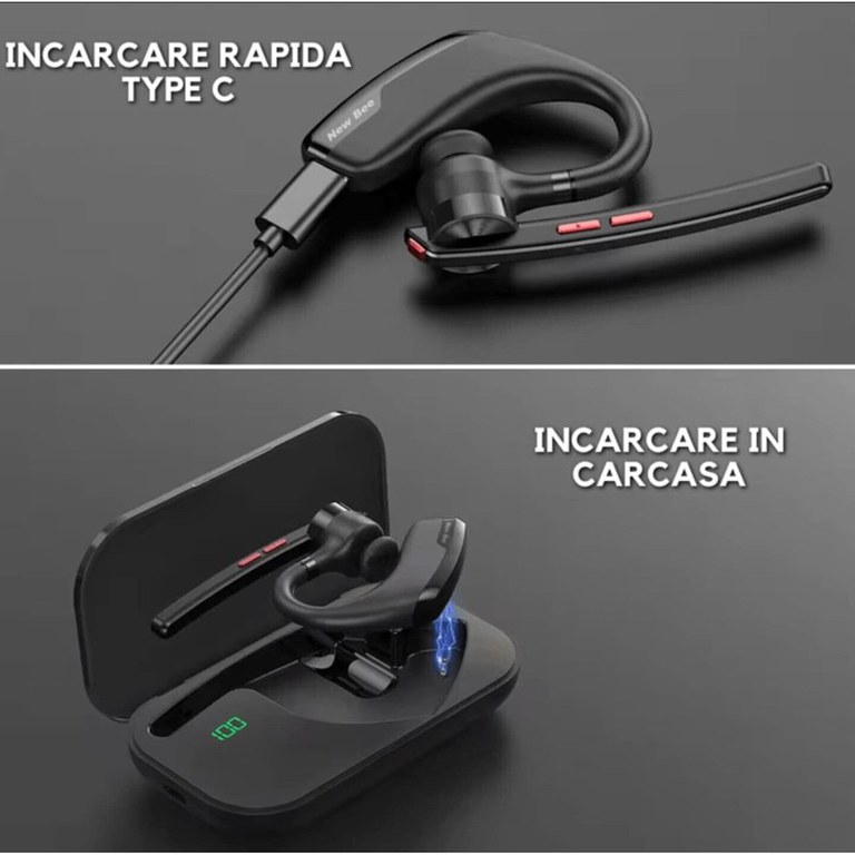 Casca Bluetooth Wireless New Bee , Baterie 60 ore 500mAH, Cu microfon dublu de reducere a zgomotului CVC 8.0, Bluetooth 5.2, Multipoint, Sunet HD, Conecatre la doua dispozitive simultan, Doua moduri de incarcare, Carcasa reincarcabila, Negru/n/nCaracteristici principale:/n/n /n Model: M51/n /n /n Versiunea Bluetooth: 5.2/n /n /n Baterie: 115mAh/n /n /n Cutie de incarcare: 500 mAh (incarcare de 3 ori)/n /n /n Timp de convorbire: aproximativ 15 ore/n /n /n Timp muzical: aproximativ 15 ore/n /n /n Timp de asteptare: aproximativ 1440 de ore/n /n /n Timp de incarcare: 2 ore/n /n /n Distanta de transmisie: 15 metri/n /n /n Microfoane: Microfoane duble CVC 8.0 Anulare zgomot/n /n /n Conexiune: Bluetooth/Se conecteaza la 2 telefoane mobile simultan/n /n /n Ecran digital: Da/n /n /n Calitate sunet: HIFI/n /n/n/n/nSpecificatii:/n/n /n Conectivitate Bluetooth 5.2: Tehnologia Bluetooth 5.2 asigura o conexiune stabila si rapida intre casca si dispozitivul tau./n /n /n Conectare Simultana la Doua Dispozitive: Permite conectarea si utilizarea simultana a doua dispozitive Bluetooth, cum ar fi un smartphone si o tableta sau un laptop./n /n /n Compatibilitate cu iOS si Android: Functioneaza perfect cu dispozitivele care ruleaza sistemul de operare iOS sau Android, oferind o experienta optima utilizatorilor indiferent de platforma./n /n /n Sunet de Inalta Definitie (HD) si Noise Cancelling: Asigura o calitate superioara a sunetului, oferind o experienta auditiva imersiva, in timp ce tehnologia de reducere a zgomotului ambiental elimina sunetele de fond nedorite./n /n /n Autonomie Extinsa a Bateriei: Bucura-te de pana la 24 de ore de utilizare continua, fara sa iti faci griji in privinta descarcarii bateriei./n /n /n Incarcare Rapida prin USB Type-C: Asigura o incarcare rapida si convenabila a bateriei, folosind portul USB Type-C, pentru a te putea bucura de mai mult timp de convorbiri si muzica./n /n /n Mod Mute si Microfon Dublu: Permite gestionarea convorbirilor cu usurinta, inclusiv activarea modului mute pentru a opri temporar sunetul, iar microfonul dublu garanteaza o claritate vocala exceptionala./n /n /n Functie Handsfree si Design Ergonomic: Asigura confort si libertate de miscare, permitandu-ti sa folosesti casca fara a fi nevoie sa tii telefonul la ureche, iar designul ergonomic se potriveste confortabil in ambele urechi./n /n /n Conectivitate Wireless si Portabilitate: Elimina cablurile inestetice si ofera o experienta de utilizare fara fir, facilitand portabilitatea si mobilitatea./n /n /n Carcasa de incarcare si protectie Inclusa: Protejeaza casca de eventualele deteriorari sau zgarieturi atunci cand nu este in uz, asigurandu-ti ca este intotdeauna in conditii optime de functionare si in acelasi timp o si incarca./n /n/n/nCascaNew Bee M51este foarte usor de folosit si de conectat. Dotata cu tehnologie Bluetooth 5.2 si microfon dublu, casca ofera o claritate incredibila a apelurilor si un sunet de inalta fidelitate, oferind astfel o buna experienta a apelurilor de ambele parti./n/nM51iti poate usura multe activitati din viata de zi cu zi datorita conexiunii stabile bluetooth si permite utilizarea telefonului mobil in diverse scenarii solicitante, precum sedinte, antrenamente sau conferinte. Profitati de sunetul HiFi oferit de cascaM51si puteti sa sporiti siguranta in trafic prin utilizarea ei./n/nPuteti utilizaM51in diverse scenarii pentru a va elibera mainile si a va bucura de libertatea wireless-ului, sporindu-va astfel eficienta. Puteti conecta 2 dispozitive Bluetooth si sa raspundeti la apeluri la oricare dintre ele. Suporta toate dispozitivele Bluetooth, cum ar fi laptopuri, tablete, smartphone-uri, inclusiv iPhone, Samsung, LG, Huawei, Motorola si alte telefoane mobile./n/nAnularea zgomotului cu microfon dublu. Functia CVC8.0 poate elimina eficient ecoul si poate face apelurile mai clare./n/nMicrofonul castilor poate fi rotit la 270 de grade, carligele pentru urechi pot fi rotite la 180 de grade, unghiul poate fi ajustat, se poate purta pe ambele urechi./nDesign unic al carligului pentru ureche. Puteti ajusta lungimea carligului pentru ureche in functie de diferitele forme de ureche. Poate fi folosita zilnic la birou, la volan, la teleconferinta, la livrare si in orice alt domeniu de activitate./n/nButon de dezactivare mirofon dedicat; Dezactivati/porniti microfonul in orice moment. In timpul unui apel, apasati pe butonul de mute pentru a dezactiva microfonul si apasati din nou pe buton pentru a activa microfonul. Apasati lung butonul de mute timp de 3 secunde pentru a apela asistentul vocal./n/nCascaM51se poate conecta la doua dispozitive in acelasi timp, iar functiile de muzica si apel pot fi comutate in orice moment. Va rugam sa retineti: desi castile se pot conecta cu doua telefoane, dar o singura data poate reda muzica sau poate suna pentru unul dintre telefoane./n/nCalitatea sunetului HIFI la 360° Efect de sunet panoramic live Adoptand un difuzor cu bobina mobila mare de 13 mm, cu ajustare profesionala a calitatii sunetului EQ, sentimentul de prezenta este mai realist, restabilind detaliile muzicii si efectele vocale reale./n/n/nCutia contine:/n1 x Casca BluetoothM51/n1 x Cutie de incarcare/n1 x Cablu USB/n1 x Manual de utilizare (engleza/rusa/spaniola/franceza/germana/italiana/japoneza)/n3 x Dopuri de urechi (1 * dimensiune mica, 1 * dimensiune medie, 1 * dimensiune mare)/n/n/nDoua optiuni de incarcare:/n1. Puneti casca in compartimentul de incarcare/n2. Utilizati cablul usb de tip C pentru a incarca./nUtilizati cablul de incarcare de tip C pentru a incarca compartimentul de incarcare./nFunctii cuprinzatoare/nOperare simpla/nTaste multifunctionale/n- Pornire: apasare lunga timp de 3 secunde (Scoateti din compartimentul de incarcare/Deconectati cablul de incarcare de tip C)/n- Oprire: apasati lung 5 secunde (Puneti in compartimentul de incarcare/incarcare cu cablu de incarcare de tip C)/n- Raspuns/inchide/redare/pauza: un singur clic/n- Respingere: apasare lunga 2 secunde/n- Reapel