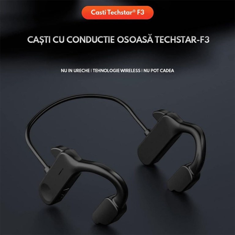 Castile cu conductie osoasa de la Techstar® F3 transmit semnalul prin conductie osoara, emit o serie de vibratii receptionate de oasele capului, fiind transmise direct in urechea interna , unde sunt interpretate ca sunete. Un avantaj deosebit al acestor casti, spre deosebire de castile clasice, headphones sau earpods este acele de a nu anula/masca sunetul inconjurator, astfel incat putem sa le folosim in siguranta in public, intrucat suntem la fel de constienti de zgomotele inconjuratoare ca si cum nu am purta casti deloc.Design cu ureche deschisa: Castile cu conductie Bon-e ofera un sunet premium prin pometi, rezultând un sunet înalt. Designul cu ureche deschisa va permite sa va bucurati de muzica fara a pierde sunetul din jur.Siguranta si conexiune: purtând casti bluetooth cu ureche deschisa, sunetele din jur pot fi auzite în continuare, evitând pericolele potentiale. Folosind un cip bluetooth 5.0, conexiunea castilor fara fir neagra este stabila si rapida. Calitate ridicata a sunetului, oferindu-va o experienta muzicala minunata.Stabil si confortabil: cadrul metalic cu memorie din titan are un efect de recuperare la îndoire, care poate mentine castile sport stabile în timpul exercitiilor intense. Este usor si confortabil, potrivit pentru utilizare pe termen lung.Rezistente la praf si la apa: certificate IPX5 rezistente la apa, castile noastre fara fir sport sunt rezistente la transpiratie, praf si umiditate. Perfect pentru sporturi în aer liber si în interior precum alergare, ciclism, drumetii, lucru etc.Durata lunga de viata a bateriei: Cu o singura încarcare, poate oferi pâna la 10 ore de muzica si apeluri continue. Baterie cu litiu de 180 mAh încorporata, timp de asteptare de pâna la 10 zile. Va puteti bucura de muzica confortabil în orice moment.Specificatii: Nume produs: casti Bluetooth Versiunea Bluetooth: BLE 5.0 Material: plastic ABS Încarcare casti: 180 mAh Timp de încarcare: 2 ore Timp de ascultare: 10 ore IPX5 rezistent la apa Dimensiune pachet: 13.5x10x6.5cm Greutate casti: 18g Gama de frecvente: 20HZ-20KHZ Distanta compatibila cu Bluetooth: 10m Functie: functie de apel/suport muzicaPachetul include:1 x Casti Audio Bluetooth.
