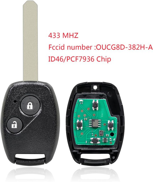 ✔ Cheie auto cu telecomanda completa, cu 2 butoane si frecventa 433MHz, potrivita pentru o gama variata de modele Honda.✔ Include placa electronica, cip transponder ID46 / PCF7936, baterie CR1616 si lama Hon66 netaiata.✔ Inlocuire perfecta pentru cheia originala deteriorata sau pierduta.✔ Se poate programa la un lacatus auto profesionist sau in reprezentanta Honda.✔ Calitate superioara – durata de viata extinsa cu pana la 20% fata de produse similare._x000D__x000D_Compatibilitate auto:_x000D_Honda:_x000D__x000D__x000D_Civic (2005–2011)_x000D__x000D__x000D_Accord (2005–2007)_x000D__x000D__x000D_CR-V (2007–2009)_x000D__x000D__x000D_Jazz (2009–2011)_x000D__x000D__x000D_✔ Compatibila doar cu telecomenzile care au FCCID: OUCG8D-382H-A, cip ID46/PCF7936, frecventa 433MHz si lama Hon66._x000D__x000D_Caracteristici cheie:_x000D__x000D__x000D_Numar butoane: 2 (inchidere/deschidere usi)_x000D__x000D__x000D_Frecventa: 433 MHz_x000D__x000D__x000D_Cip transponder: ID46 / PCF7936_x000D__x000D__x000D_FCCID: OUCG8D-382H-A_x000D__x000D__x000D_Lama: Hon66 (netaiata)_x000D__x000D__x000D_Baterie: CR1616 inclusa_x000D__x000D__x000D_Electronica interna: inclusa_x000D__x000D__x000D__x000D_Continut pachet:_x000D__x000D__x000D_1 x cheie auto cu telecomanda pentru Honda_x000D__x000D__x000D_Include cip, baterie, electronica si lama Hon66_x000D__x000D__x000D__x000D_Atentie:Cheia necesita programare in service autorizat sau la un lacatus auto. Lama trebuie taiata pentru a corespunde cilindrului original. Verifica compatibilitatea cu cheia ta originala inainte de comanda (forma, butoane, frecventa, cip)._x000D__x000D__x000D_