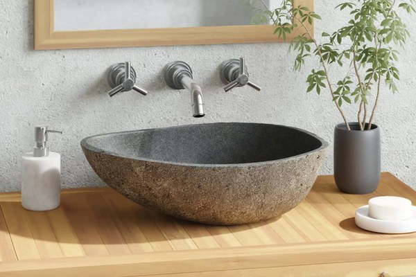 Aceasta chiuveta ovala, realizata din piatra de rau naturala, va fi un element de decor elegant pentru orice baie sau camera de toaleta. Acest bazin unic din piatra naturala nu este doar o chiuveta practica pentru utilizarea de zi cu zi, ci si un element decorativ pentru spatiul dvs. de locuit. Se va potrivi cu siguranta oricarui stil interior. Suprafata interioara este neted lustruita, facand curatarea foarte usoara. Orificiul de scurgere are un diametru de 4,5 cm. Puteti gasi mai multe lavoare din lemn de tec potrivite in magazinul nostru, pentru a obtine un set complet de chiuvete pentru baie. Nota: Piatra de rau este un produs natural si, prin urmare, pot aparea diferente de culoare si forma, va rugam sa consultati fotografiile produsului pentru exemple. Produsul real poate fi mai deschis sau mai inchis decat in fotografii si, uneori, poate avea un amestec de culori. In cazul comandarii mai multor chiuvete, nu se poate garanta ca dimensiunea, forma si culoarea vor fi aceleasi.Material: Piatra de rauDiametru orificiu de scurgere: 4,5 cmCu o marja de toleranta de +/-10 mm pentru inaltime