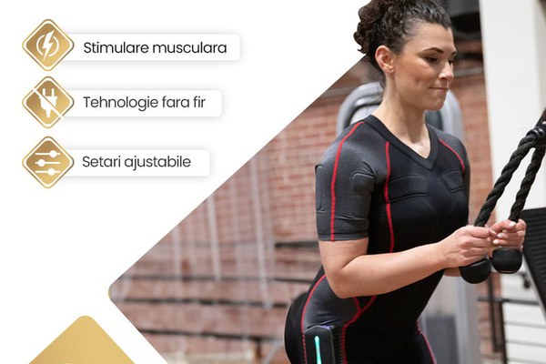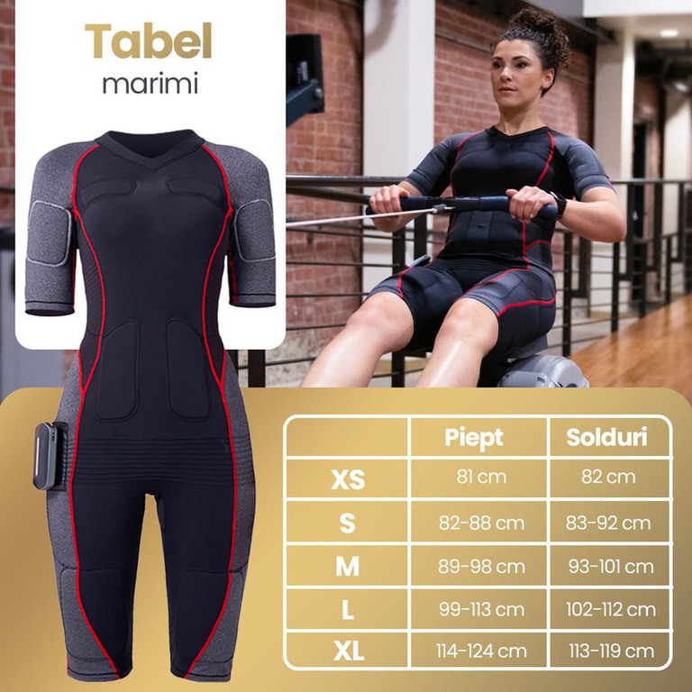 /n/n /nEMS (ElectroStimulare Musculara) reprezinta contractia musculaturii cu ajutorul impulsurilor electrice. Aceasta tehnica este utilizata de peste 50 de ani in medicina generala si este recomandata pentru recuperare post traumatism, remodelarea corporala, tonifiere si slabire. Tehnologia EMS a fost testata in cel mai mic detaliu si acum este utilizata inclusiv de sportivi pentru imbunatatirea performantelor in timpul antrenamentelor. /n/nEfectele sunt garantate si rapide pentru ca putem lucra mai multe grupe de muschi intr-un singur antrenament, ceea ce in mod normal nu am putea face asta prin exercitii fizice normale… 20 de minute de electrostimulare echivaleaza aproximativ doua ore de sala intens. Musculatura lucreaza in urmatoarele 24 de ore de la terminarea antrenamentului cu Costumul EMS. /n/n/nINTREBARI FRECVENTE: /n/n1. Trebuie sa ma ajute cineva cu cablurile sau cu setarile pentru antrenament? /nCostumul EMS este cu noua tehnologie wireless (fara fir) si este foarte usor de imbracat/ utilizat. Aplicatia mobila este foarte intuitiva si in plus vine cu instructiuni clare. /n/n2. Aplicatia are antrenamente stabilite? /nAplicatia mobila este pentru setarile costumului, intensitate, perioada antrenament, activarea/ dezactivarea electrozilor, diferiti indicatori. /n/n3. Curentii eliberati in musculatura dauneaza corpului pe termen lung? /nTermenul de EMS este abrevierea Electro Muscular Stimulation: stimularea electrica a musculaturii. Impulsul electric cu frecventa scazuta este utilizat pe scara larga atat in antrenamente cat si terapiile de reabilitare. Nu afecteaza coloana vertebrala si nu pune presiune pe articulatii, contribuind astfel la o stare generala de bine. Din punct de vedere tehnic este o metoda sigura si eficienta de tensionare a muschilor prin intermediul unui impuls electric, implicand astfel peste 90% din muschii corpului. /n/n4. De ce se recomanda maxim 3 antrenamente pe saptamana daca nu dauneaza? /nConform studiilor germane nu este benefic sa te antrenezi mai des pentru a obtine rezultate mai bune deoarece antrenamentul EMS este destul de intens si eficient. Corpul tau are nevoie de odihna si regenerare pentru a obtine rezultate cat mai eficiente si mai rapide. /n/n/n5. In cat timp se vad rezultate? /nCel mai rapid se realizeaza tonifierea musculaturii, simtita imediat dupa primul antrenament. Corpul elibereaza endorfine si postura se va imbunatati datorita activarii intregii musculaturi. Dupa 3-4 antrenamente EMS se va sesiza o diferenta vizibila asupra reducerii tesutului adipos. Cresterea masei musculare, este un proces mai lung, iar rezultatele sunt vizibile dupa mai multe antrenament EMS. Pentru a avea rezultate excelente, avem nevoie si de o alimentatie sanatoasa, adecvata stilului nostru de viata. /n/nINTRETINERE: /nSe poate spala manual sau la masina automata cu program scurt, de maxim 30 de grade si fara centrifuga/ uscare. /n/nRECOMANDARE: /nEste pentru tine daca iti doresti o slabire si tonifiere rapida, sa elimini celulita, sa scapi de durerile de spate, daca esti proaspata mamica si ai nevoie de recuperare postnatala, recuperare post traumatica, recuperare post operatorie. /n/n/nATENTIONARE: /nNU este indicat persoanelor care au stimulator cardiac sau alt dispozitiv electronic in organism, femeilor insarcinate, diabet, hernie, boli cardiace grave, sau pentru persoane care sufera de tulburari psihice grave. /n/nIMPORTANT /nVerifica tabelul de marimi inainte de plasare comanda. Este foarte important sa fie marimea corespunzatoare, ca electrozii sa fie bine fixati pe piele, sa nu fie larg costumul. /n/n
