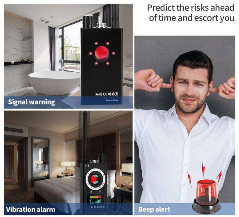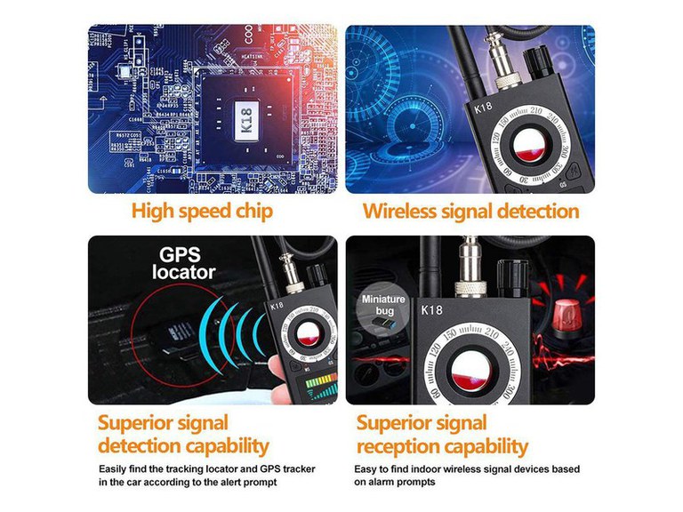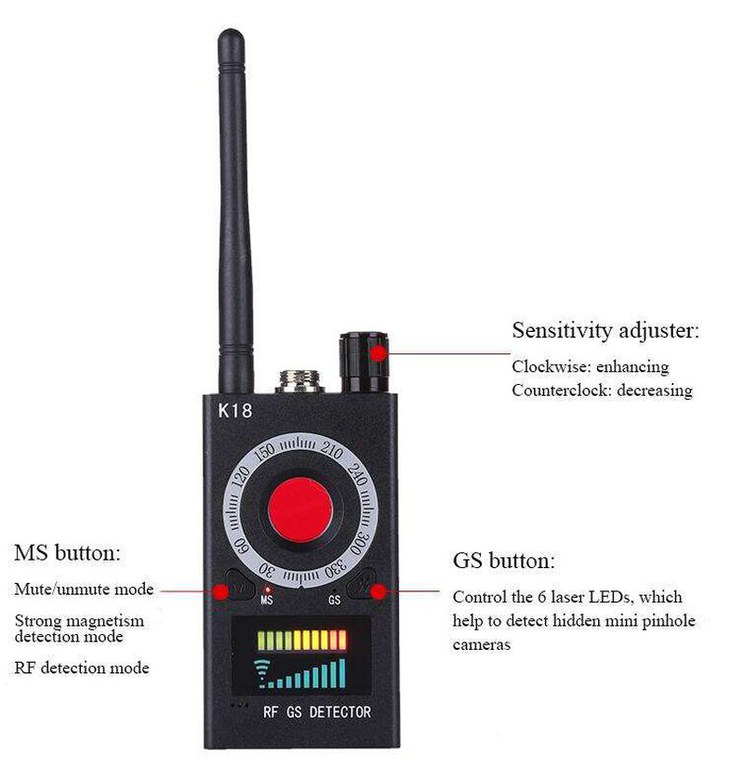Acesta este un produs profesional, de uz militar ce poate detecta camerele ascunse, microfoanele, telefoanele mobile si GPS trackerele, dispozitive bazate pe variatia campului electromagnetic, precum si detectarea magnetica a localizatoarelor GPS./nFrecventa scanare: 1 MHZ — 6.5 GHZ/nTimp de lucru: 24 - 35 ore/nAlimentate: 60 - 110 mAh/nDetectare interval dinamic: ? 73 dB/nSensibilitate: ≤ 0.03 mw/nAcumulator: 3.7 V 1000 mAh/nArie acoperire: 5-15 metri patrati pentru retele GSM 2G/3G/4G/n10 mp pentru camerele wireless standard de 10mW la 2,4Ghz15 mp pentru camerele wireless standard de 10mW la 1,2Ghz/nDimensiuni: 117*56*20 mm/nMaterial: Plastic/nStandby time: 25 zile/nGreutate: 150 g/nDetecteaza: camere video wireless, telefoane mobile, microfoane, microfoane wireless, tracker gps cu date gprs sau orice alt dispozitiv ce emite semnale intre 1Mhz si 12Ghz/nAntena: 1MHZ-8000MHZ/n/nInstructiuni de ultilizare pentru detectie electromagnetica MANUALA:/n/nSe infileteaza antena;/nSe urmareste ca ledul rosu sa fie aprins in pozitia MS; ( daca nu este aprins, atunci se tine apasat lung pe butonul M )/nSe porneste dispozitivul si se regleaza din potentiometru astfel incat sa fie aprinse ledurile pana la pozitia 3 de pe scara ( intre 2 si 4 ideal ), pentru a avea sensibilitate mare;/nSe misca dispozitivul in zona in care sunteti interesati si daca se va modifica campul electromagnetic, ledurile vor incepe sa se aprinda si aparatul isi va modifica si zgomotul;/nIn acel moment cand aveti mai multe leduri aprinse, puteti scadea sensibilitatea din potentiometru, iarasi pana cand aveti 2-4 led-uri, si implicit veti micsora zona de cautare, pana cand aparatul va incepe iarasi sa aprinda ledurile verzi si sa isi modifice zgomotul emis;/nIn acest mod va puteti apropia cu exactitate de sursa campului electromagnetic;/nPentru a va obisnui cu dispozitivul, puteti exersa pe un router wifi, sau pe un telefon mobil aflat in convorbire;/nRecomandam sa nu se efectueze cautarile cu telefonul mobil in buzunar sau langa un telefon mobil./n/nInstructiuni de ultilizare pentru detectie magnetica N-S:/n/nSe introduce proba magnetica;/nSe muta in pozitia GS, tinand apasat lung pe butonul M;/nIn acel moment se poate cauta orice sursa magnetica ( tracker gps ) prin diverse locuri din interiorul autovehiculului sau in casa;/nDaca va detecta camp magnetic, acesta va incepe sa emita semnale audio si ledurile vor incepe sa se aprinda succesiv./n/n/n