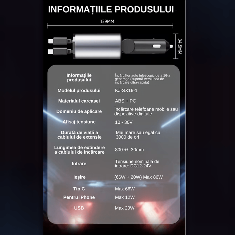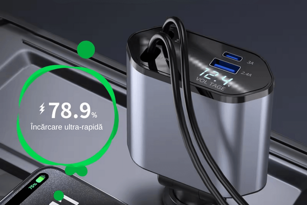 Incarcator Auto 4 in 1 Multifunctional, Incarcare Rapida, Incarcare Simultana, Auto-Reglabil, Design cu 2 Cabluri de Date (Tip-C 100W, iOS 20W) si 2 Porturi (USB 2.4A, Tip-C 3A), Indicator LED Digital, Tehnologie Avansata a Cip-ului, Stabilitate TermicaExperimenteaza viitorul incarcarii auto! Dotat cu cele mai noi tehnologii, incarcatorul auto 4-in-1 ofera o putere de incarcare incredibila, de pana la 100W, pentru dispozitivele tale compatibile. Cu incarcare rapida, auto-reglabila si protectie termica, poti fi sigur ca dispozitivele tale sunt in siguranta si se incarca la viteza optima. Indicatorul LED digital iti ofera informatii in timp real despre procesul de incarcare, iar design-ul robust si durabil este construit pentru a rezista in cele mai dificile conditii.Incarcare Rapida si Simultana Incarcatorul dispune de 2 cabluri de date integrate (Tip-C 100W si iOS 20W) si 2 porturi suplimentare (USB 2.4A si Tip-C 3A), permitand incarcarea rapida a pana la patru dispozitive in acelasi timp. Performanta ramane constanta, indiferent de numarul de dispozitive conectate, asigurandu-se ca toate sunt incarcate eficient si prompt.Design Ergonomic si Durabil Cu un design modern gri-negru, incarcatorul se integreaza armonios in interiorul oricarei masini. Indicatorul LED digital ofera informatii clare si in timp real despre starea incarcarii, in timp ce cablurile robuste sunt concepute pentru a rezista in timp.Compatibilitate Larga roiectat pentru a fi compatibil cu o gama variata de dispozitive, incarcatorul auto ofera flexibilitate si usurinta in utilizare. Indiferent de echipamentul pe care il folosesti, acest incarcator se adapteaza pentru a oferi performante optime.Incarcatorul Auto 4 in 1 Multifunctional ofera o solutie completa pentru incarcarea in siguranta si rapida a dispozitivelor tale in miscare. Conceput pentru a indeplini nevoile celor care calatoresc frecvent, acest dispozitiv combina eficienta, comoditatea si durabilitatea intr-un singur produs compact si fiabil.Tehnologie Avansata cu Auto-Reglare Echipat cu tehnologie avansata a cipului si functie de auto-reglare, acest incarcator optimizeaza automat fluxul de energie, garantand o incarcare rapida si sigura. Stabilitatea termica protejeaza dispozitivele de supraincalzire si asigura o durata de viata extinsa a acestora.