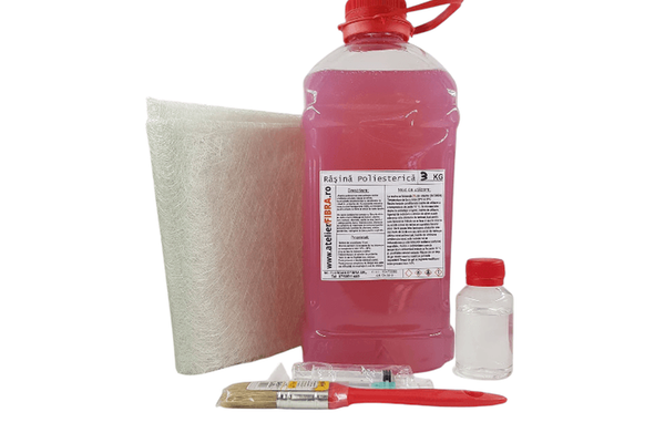 Pachetul Contine :* 3 KG Rasina poliesterica * 3 Metri Patrati de fibra de sticla stratimat cu densitatea de 150g/m2 - pliata A4* 70 ml intaritor ( se foloseste 2%) Bonus* Pensula * Seringa pentru dozarea corecta a intaritoruluiMaterialele se folosesc in tinichigeria auto eliminand rugina , reparatii bari auto, carene moto, cisterne sau butoaie din fibra de sticla , tuning auto , matrite piese sau ambarcatiuni Pachetul este suficient pentru o suprafata de aproximativ 2-3 mp intr-un strat de aproximativ 1mm grosime-Rasina poliesterica preaccelerata cu emulsie redusa de stiren, rezistenta mecanica buna, Nu este transparenta 100%, dupa uscare are culoarea alb-galbuie semitransparentaSe foloseste pentru armare cu fibra de sticla de toate tipurileEste folosita in industria materialelor compozite, aeronautica, ambarcatiuni, auto, moto, eoliene etc.Se poate folosi cu succes la:Lipirea tevilor / rezervoarelor unde nu este presiune sau este o presiune micaAncorarea elementelor metalice in structuri de beton si injectarea in structuri de beton afectate / crapate.Prin armarea cu fibre de sticla sau carbon se pot obtine piese / suporti / elemente cu o rezistenta foarte ridicata.Se pot lipi bari auto.Se pot lipi caroserii acolo unde actiunea coroziunii nu permite utilizarea chitului.Se pot lipi gauri si zgarieturi in coca ambarcatiunilor si sky-jeturilor.-Intaritorul este Butanox , tara de origine Turcia, se foloseste in raport de 2%- Fibra de sticla este stratimat emulsie si are o densitate de 150g / m2Recomandari pentru utilizare Mod de preparare: Rasina se amesteca cu 2% intaritor si are timp de intarire 25 de minute la o temperatura de 20-25 grade .Indicat a se lucra in spatii aerisite foarte bine A nu se folosii mai mult de 2%intaritor